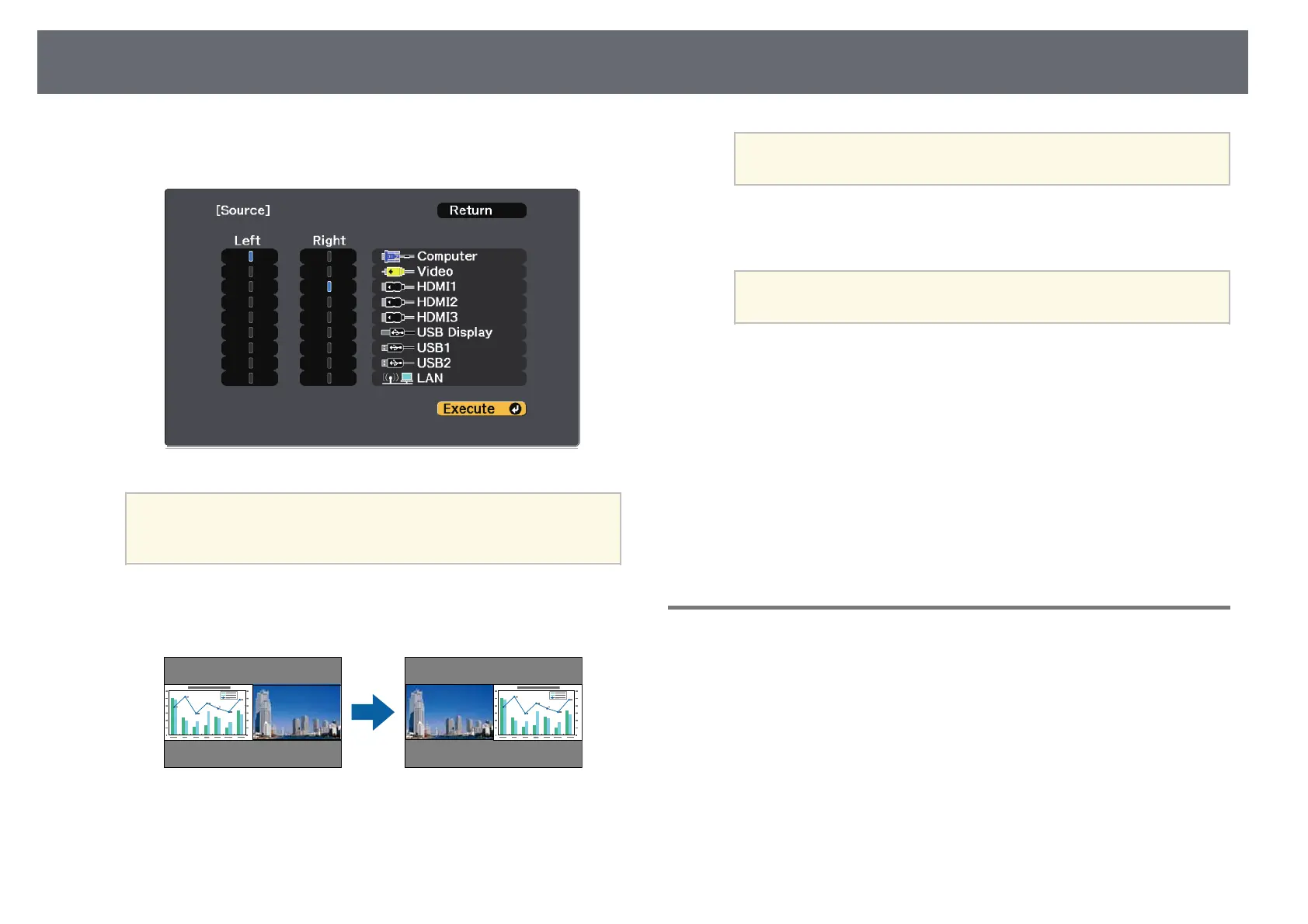 • "Unsupported Input Source Combinations for Split Screen Projection" p.113