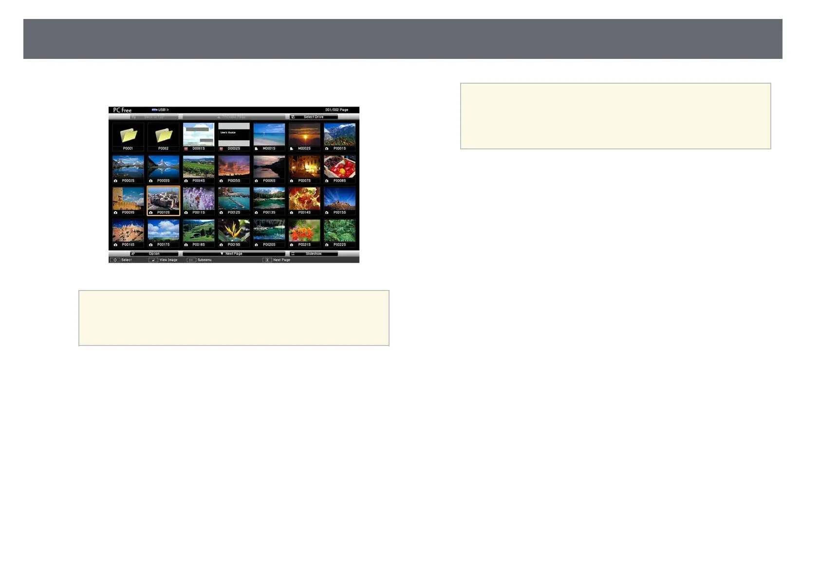 • To view additional files in a folder, highlight Next Page or Previous
