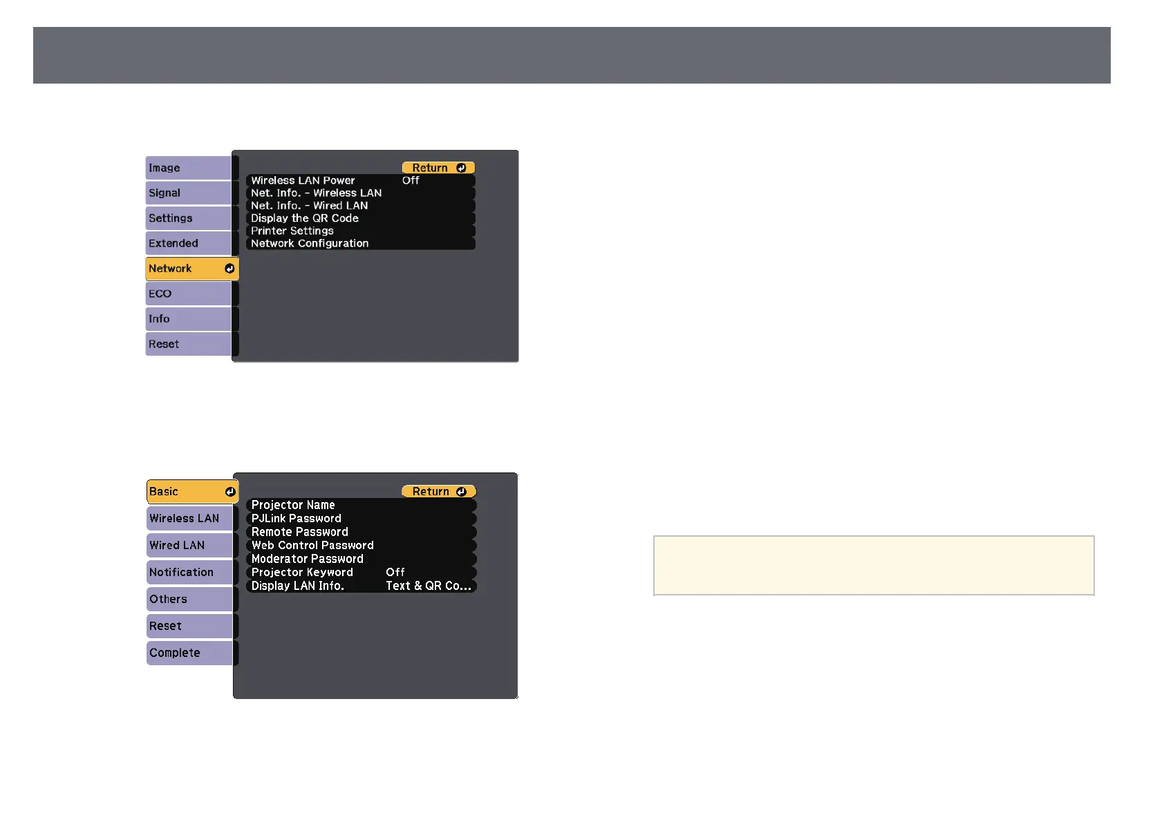 • PJLink Password lets you enter a password up to 32 alphanumeric