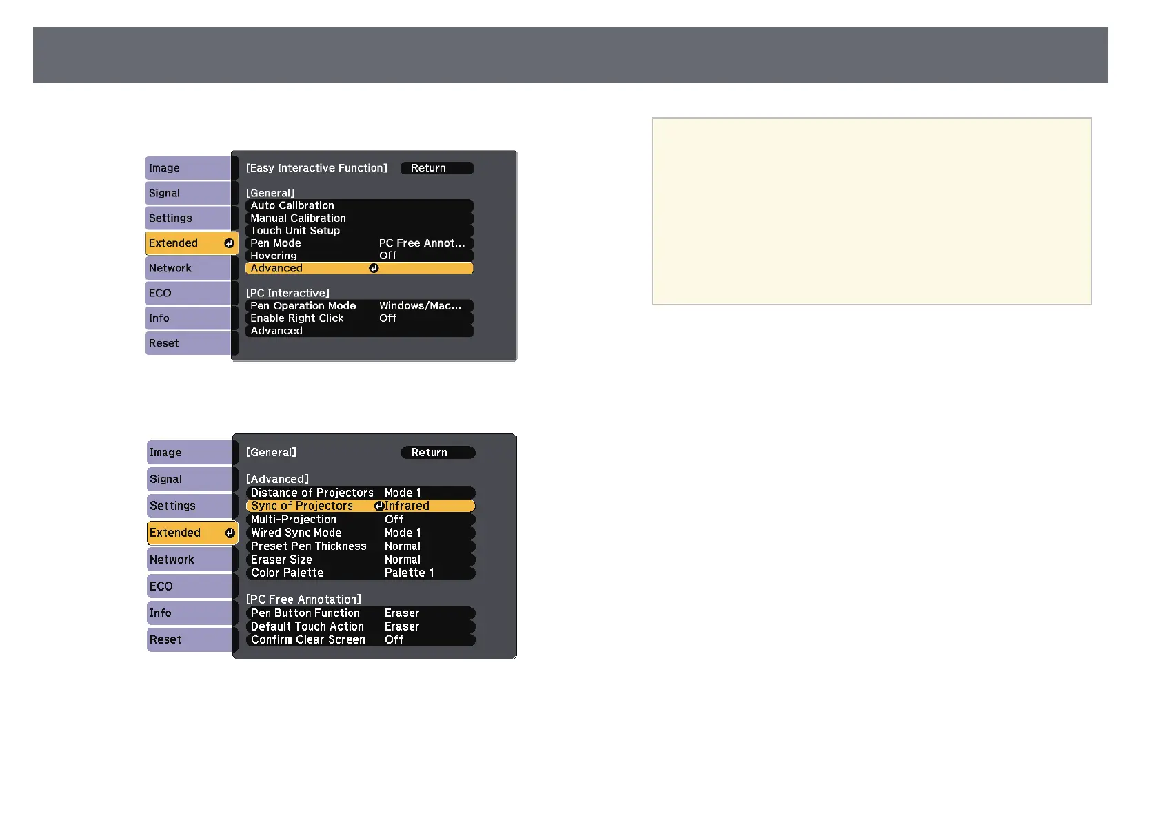 Wired Sync Mode setting to Mode 2 in the projector's