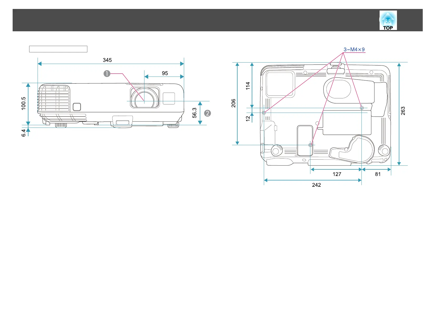 Epson EB-925 - Appearance; Center of lens; Distance from center of lens to suspension bracket fixing point