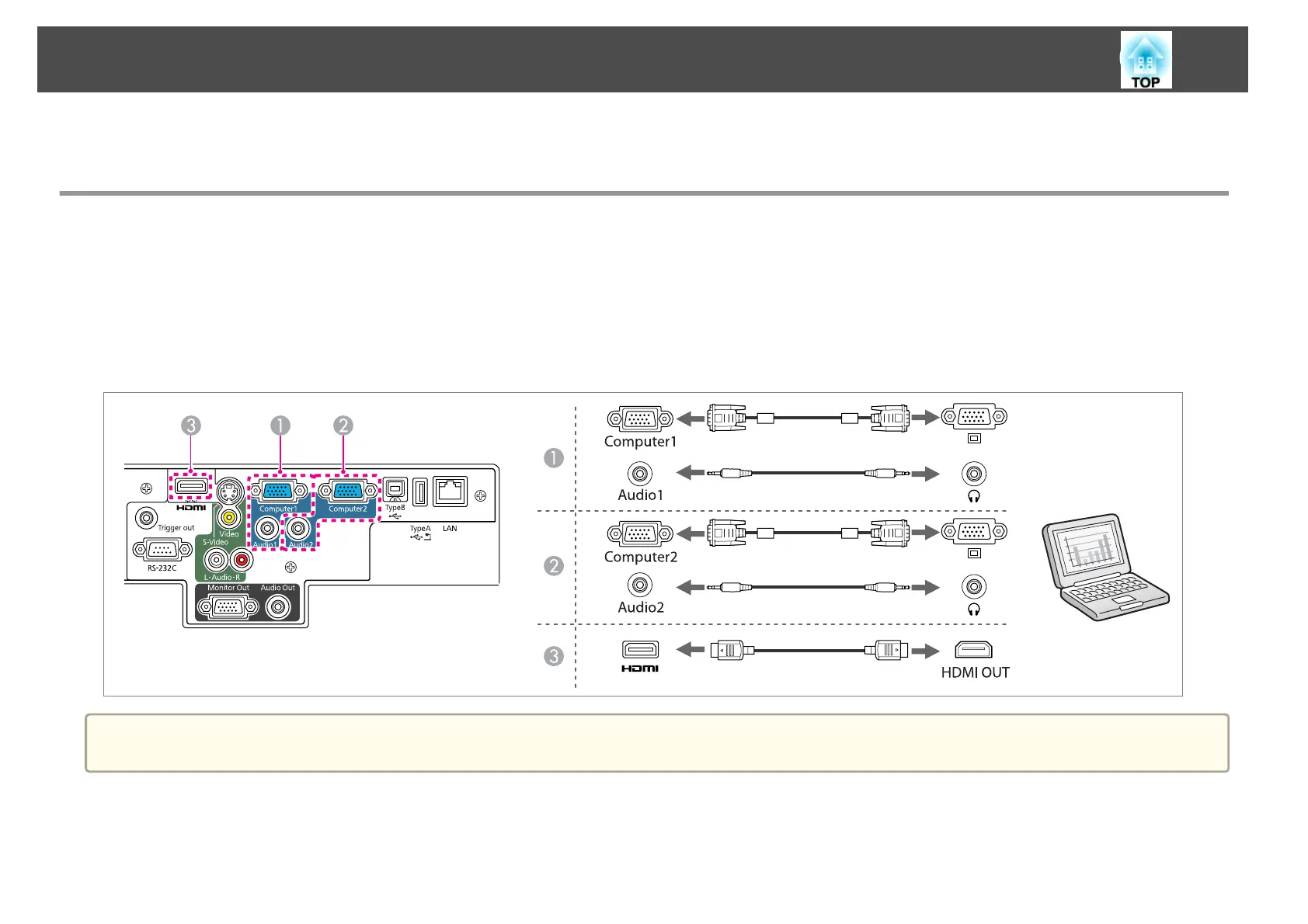 Connect the computer's display output port to the projector's Computer1 or Computer2 port.