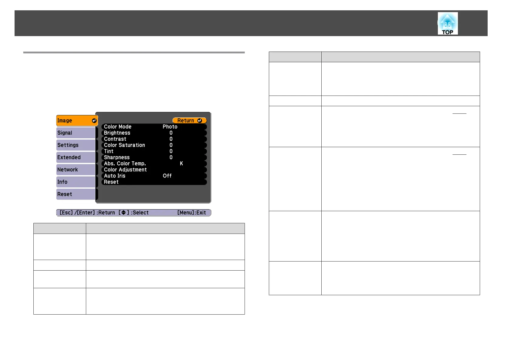 Settable items vary depending on the image signal and source currently
