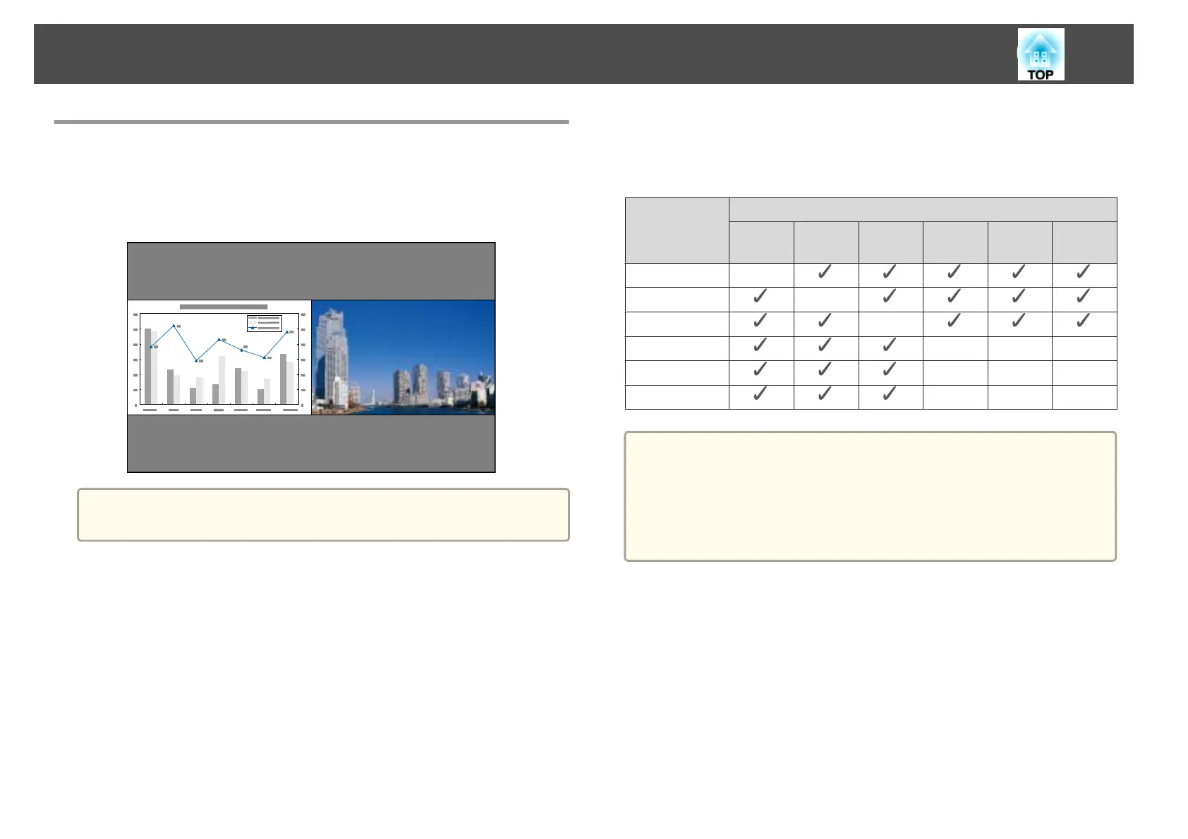 The combinations of input sources that can be projected on a split screen