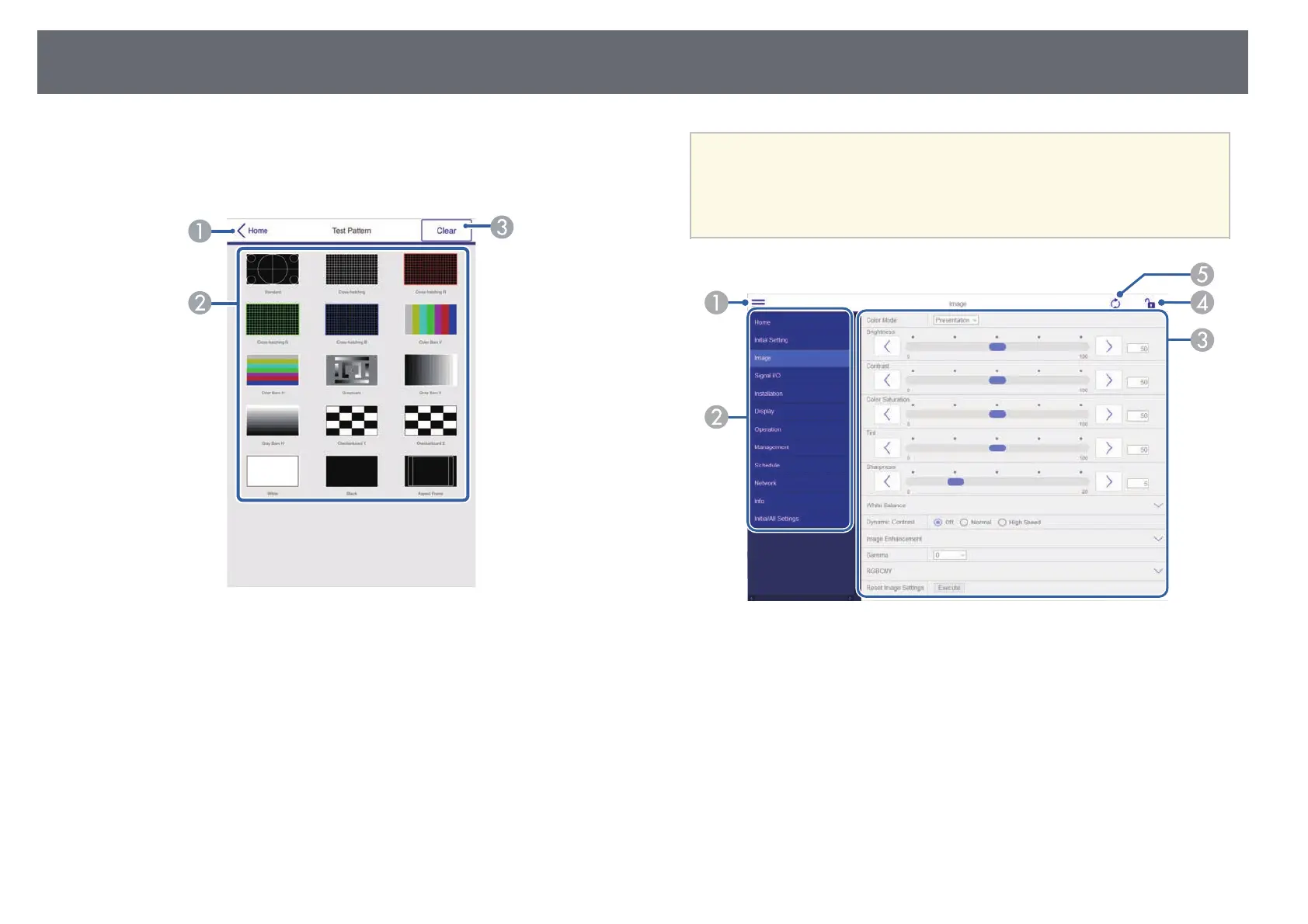 Displays available test patterns; select to project a test pattern. (The available test
