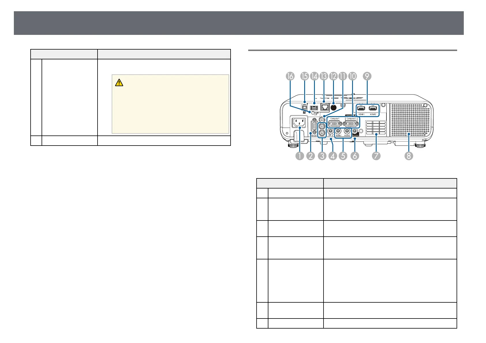 Power inlet Connects the power cord to the projector.