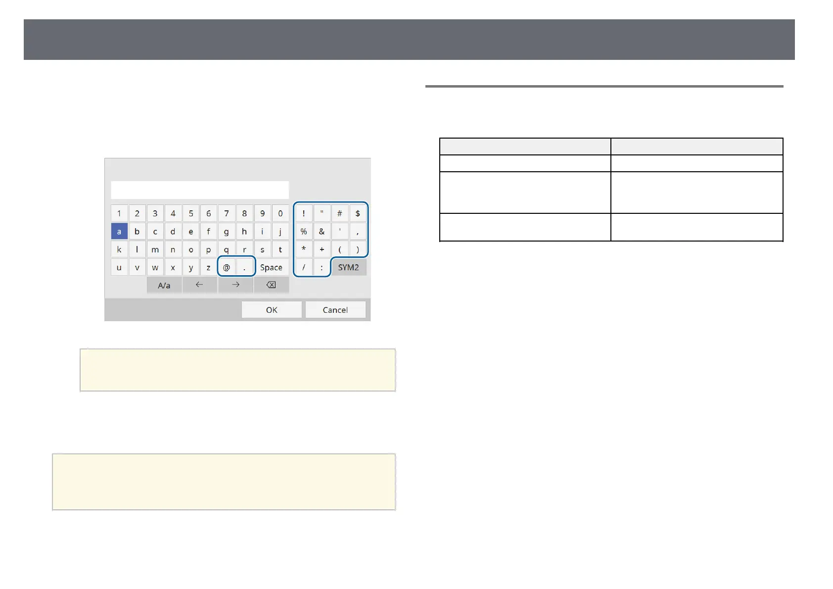 You can enter the following text when using the displayed keyboard.
