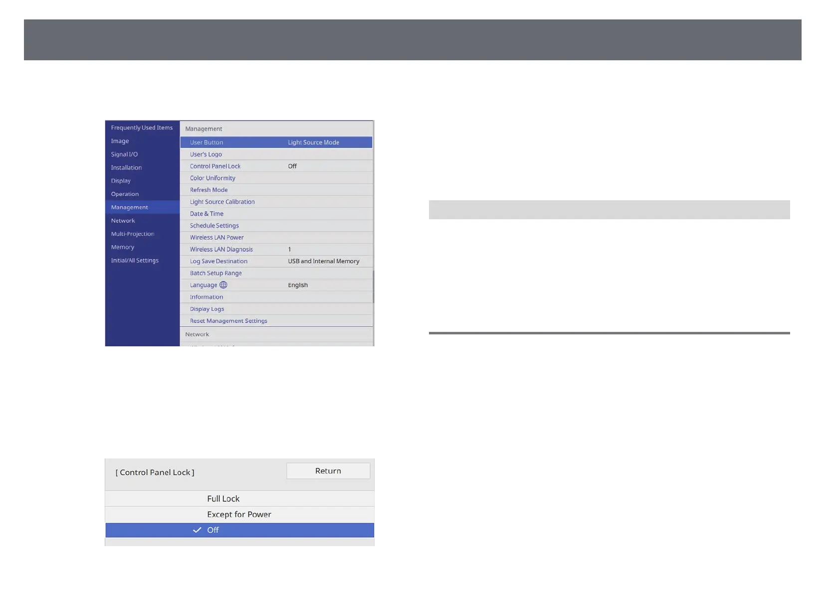 • Set the Control Panel Lock setting to Off in the projector's Management