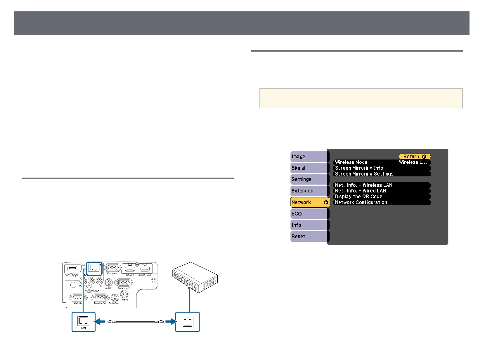 To connect the projector to a wired local area network (LAN), use a 100Base-
