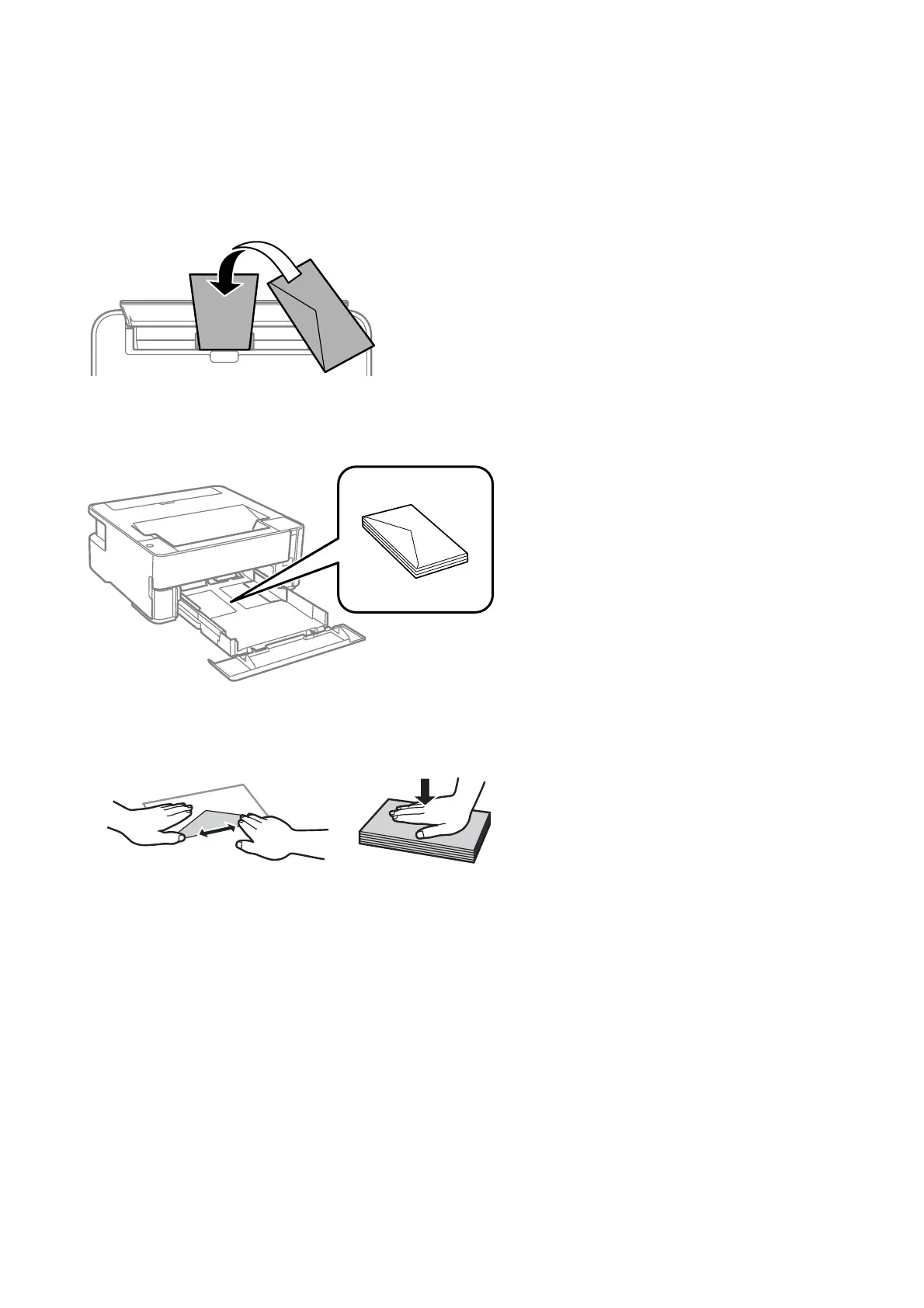 ❏ Fan and align the edges of the envelopes before loading. When the stacked envelopes are pued up with air,
