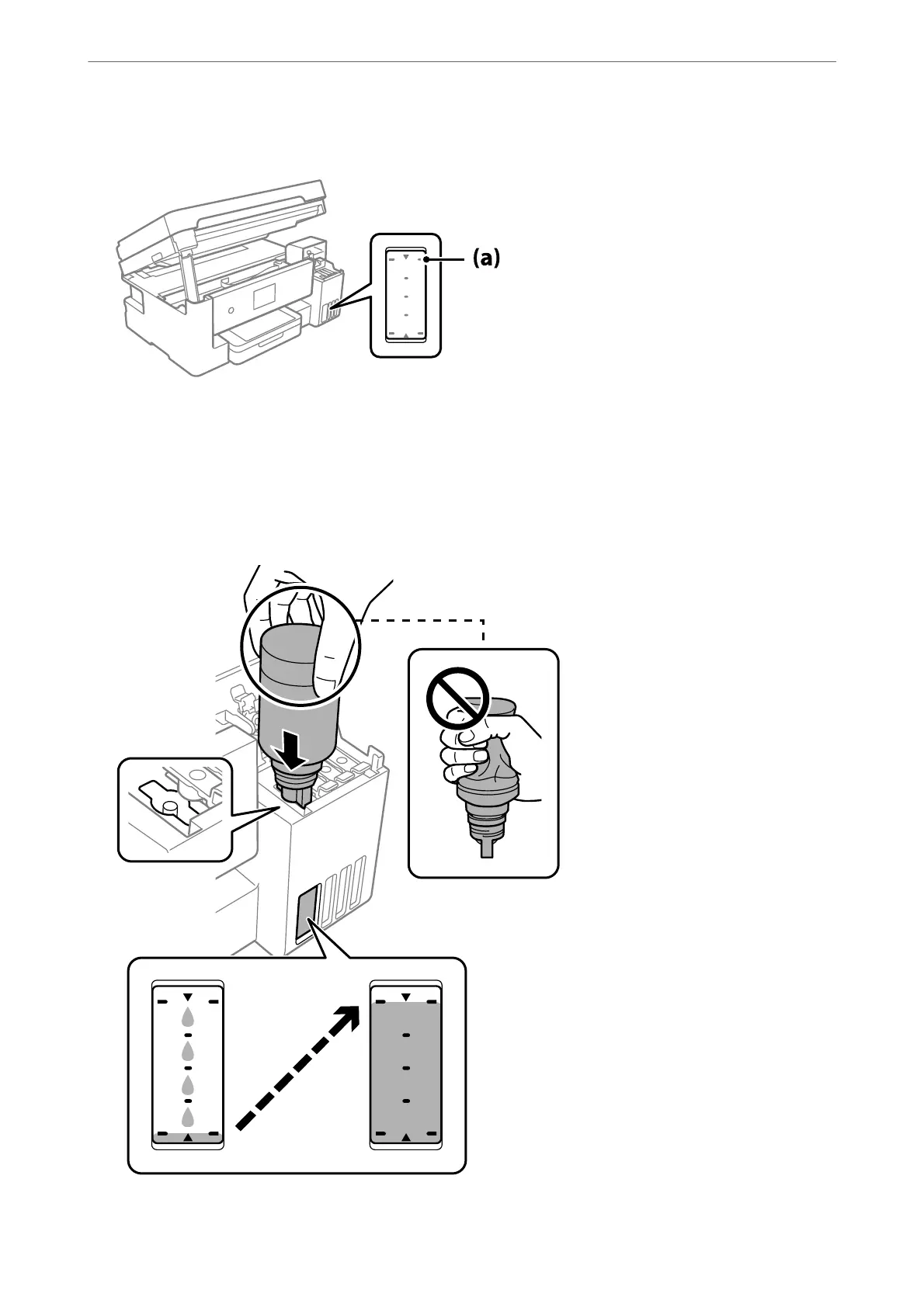 the ink bottle when the ink has reached the top line; otherwise ink may leak.