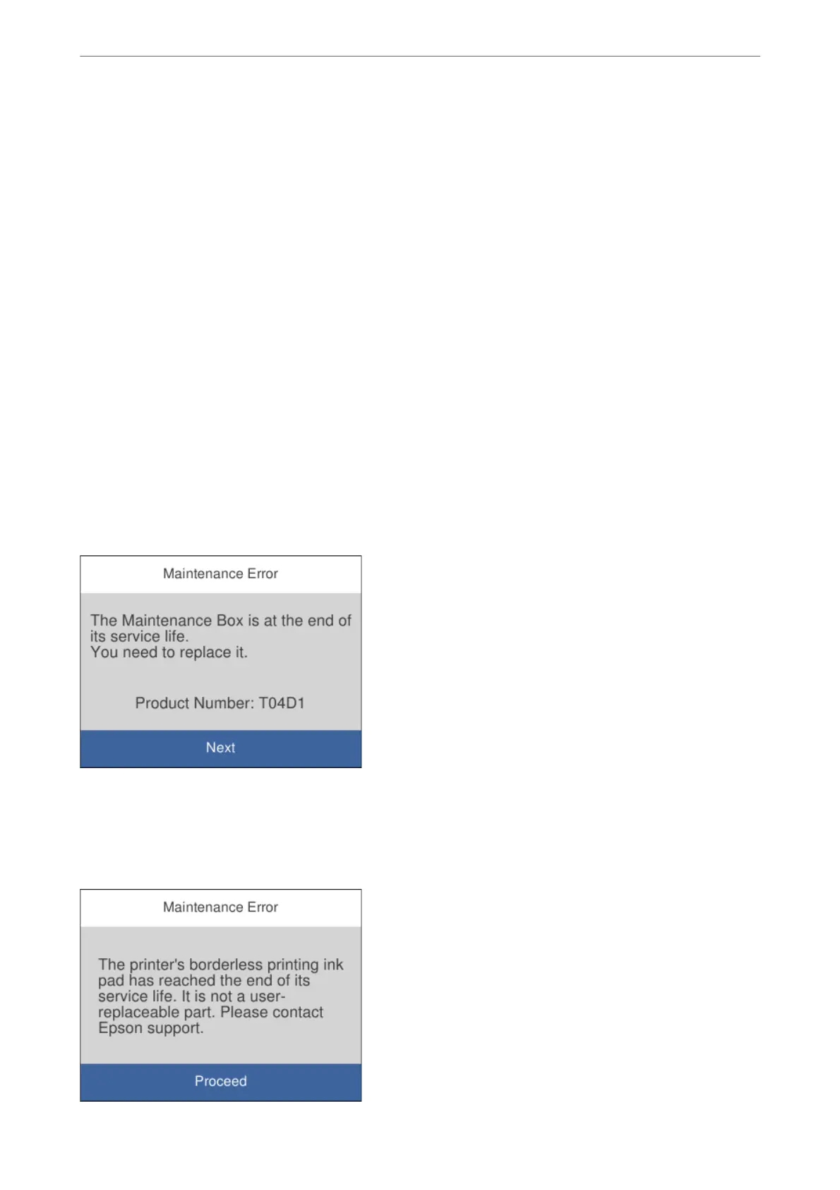 ❏ When the following screen is displayed, the part cannot be replaced by users. Contact Epson support.