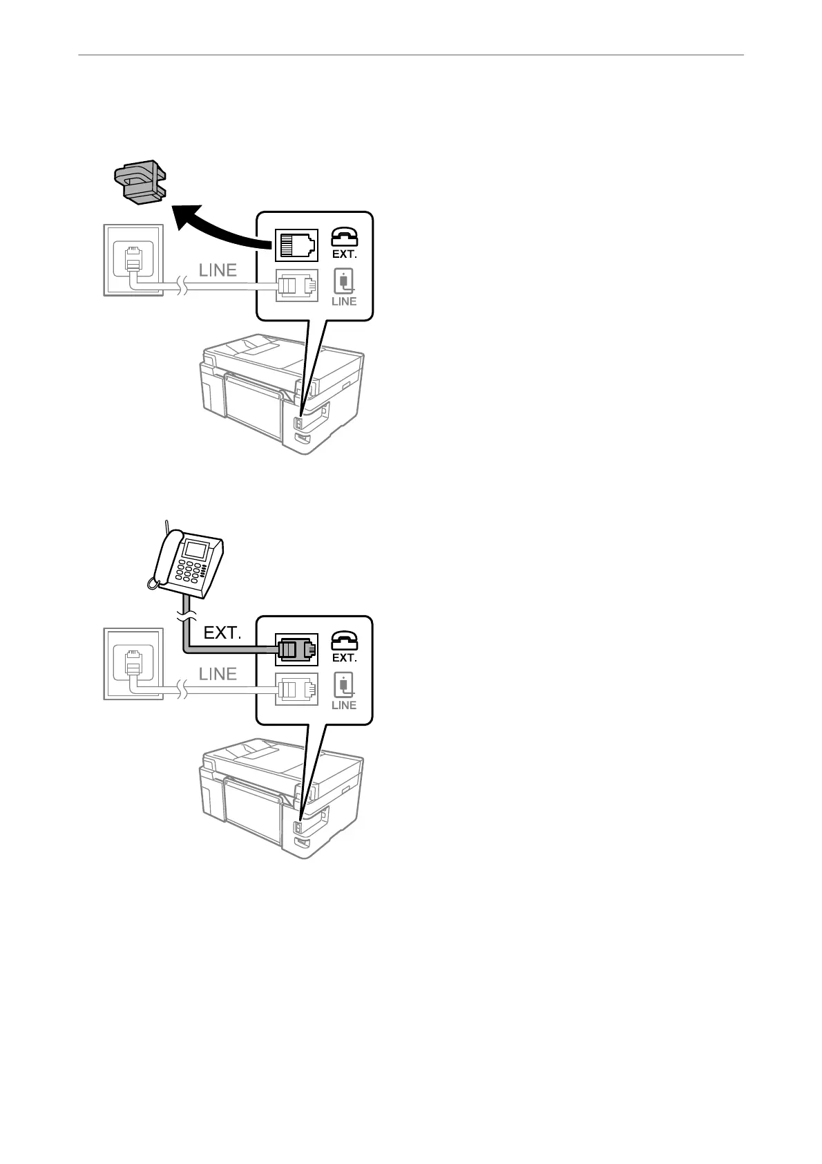 When sharing a single phone line, make sure you connect the phone device to the EXT. port of the printer. If you split