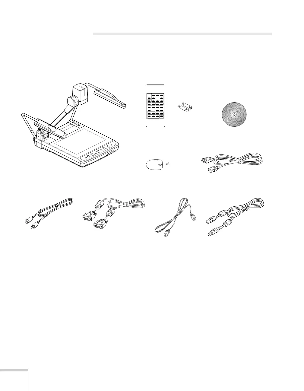 After unpacking the document camera, make sure you have all the