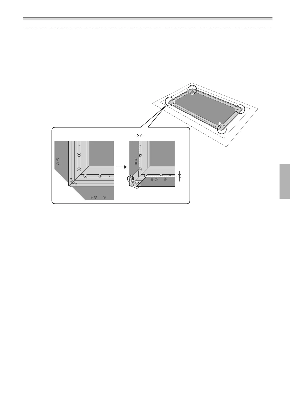 Os orifícios dos parafusos (dois pontos) nos quatro cantos não ficam revestidos pela tela do ecrã.