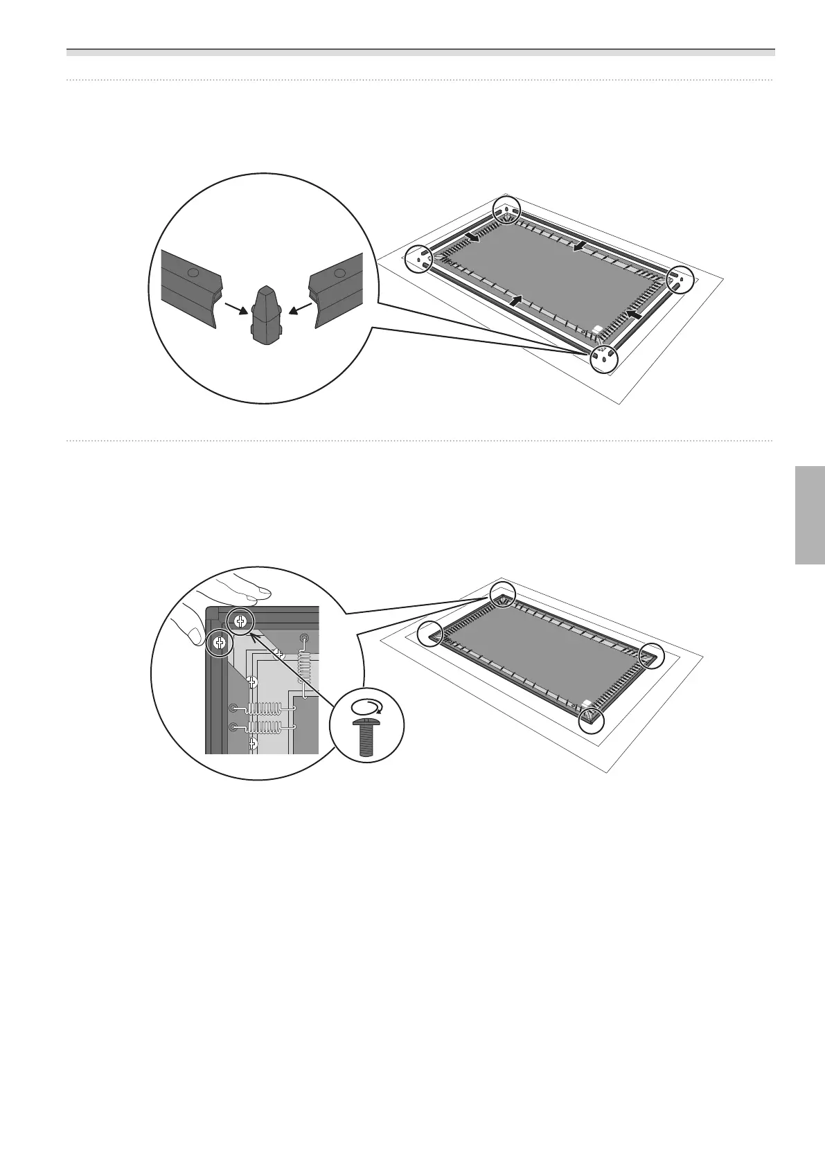 Aperte os parafusos enquanto segura firmemente nas molduras, de modo a que os protetores de canto