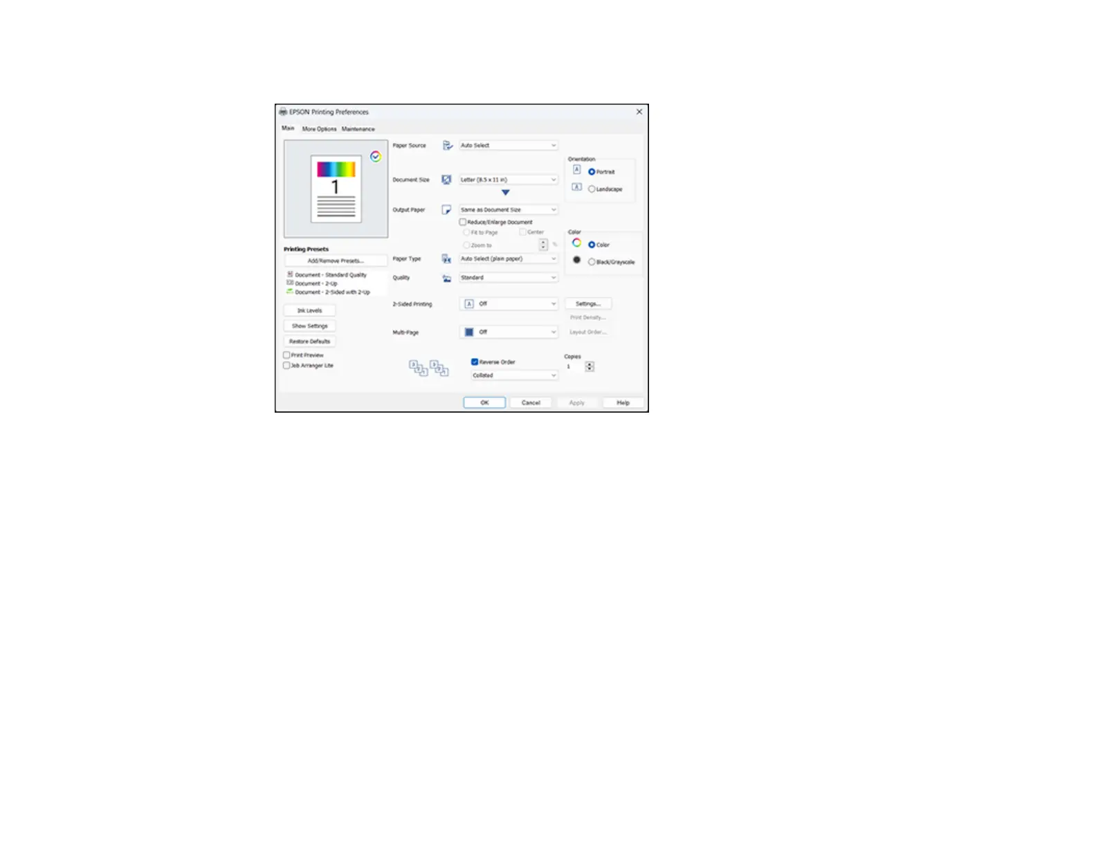 You see the Main tab of your printer settings window: