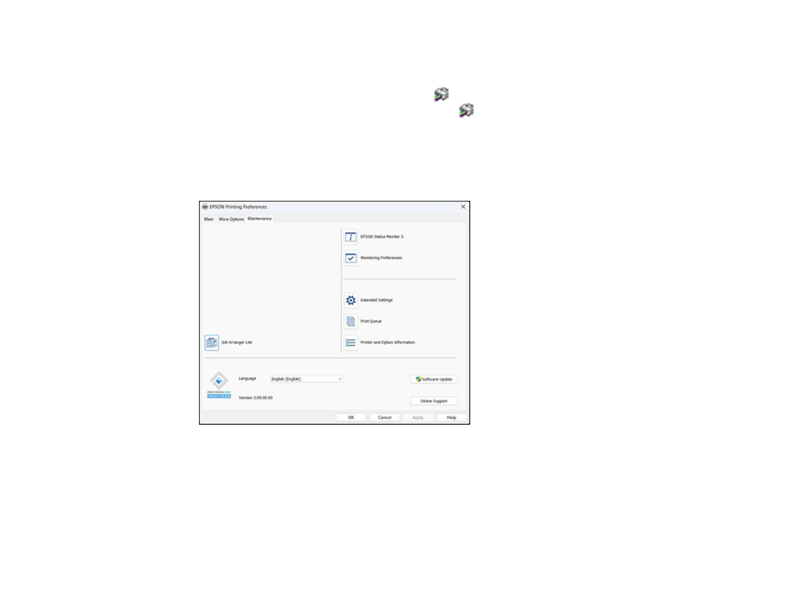The printer software screens appear in the language you selected the next time you access them.
