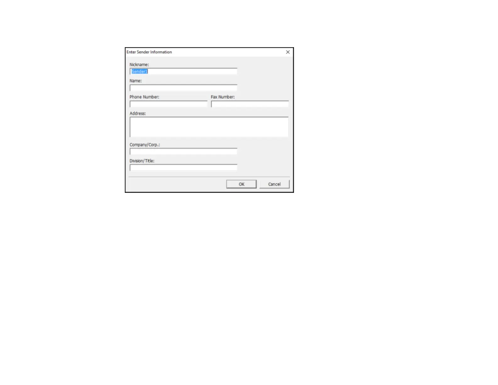 6. Enter your sender information so that recipients can identify the origin of the fax. Then click OK to