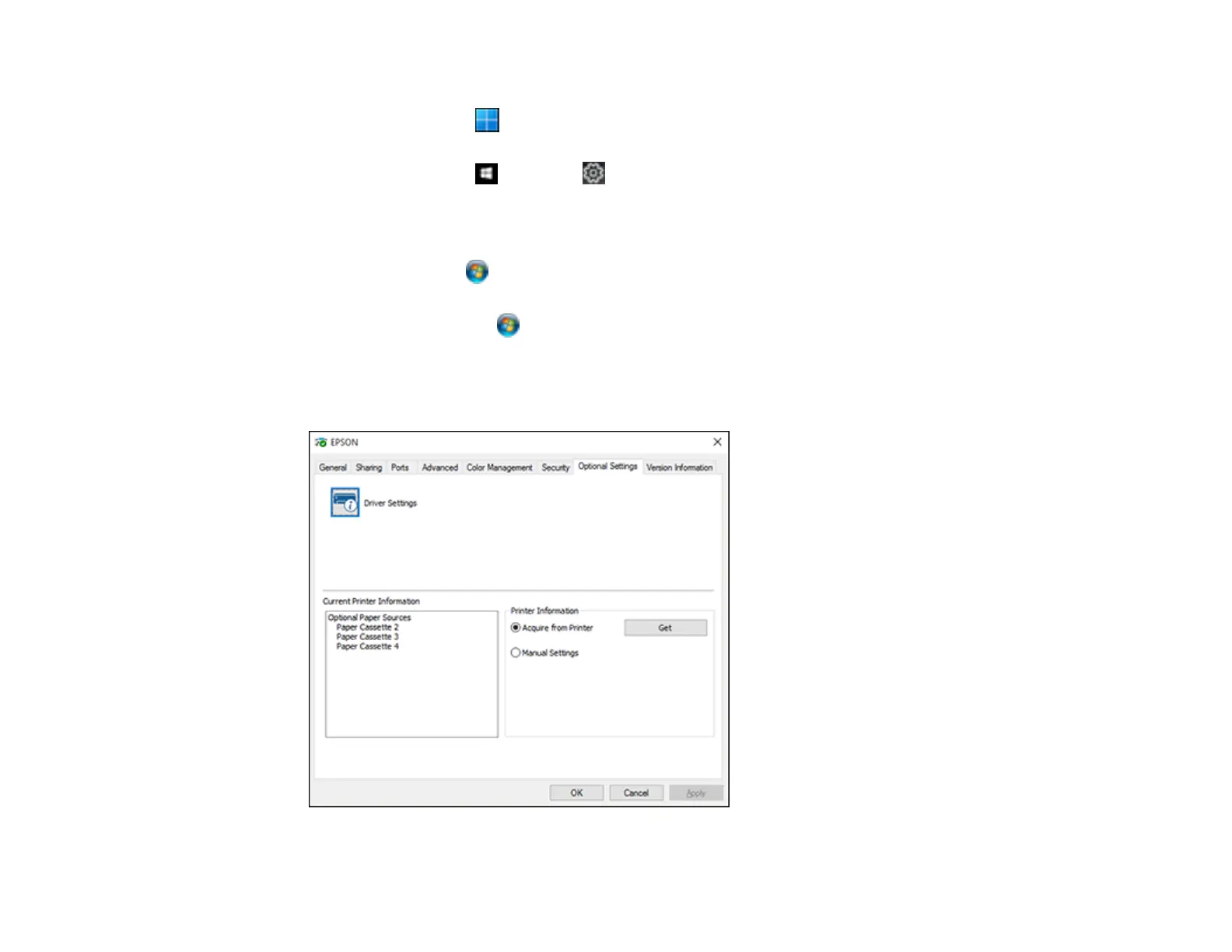 • Windows Vista: Click and select Control Panel. Click Printer under Hardware and Sound,