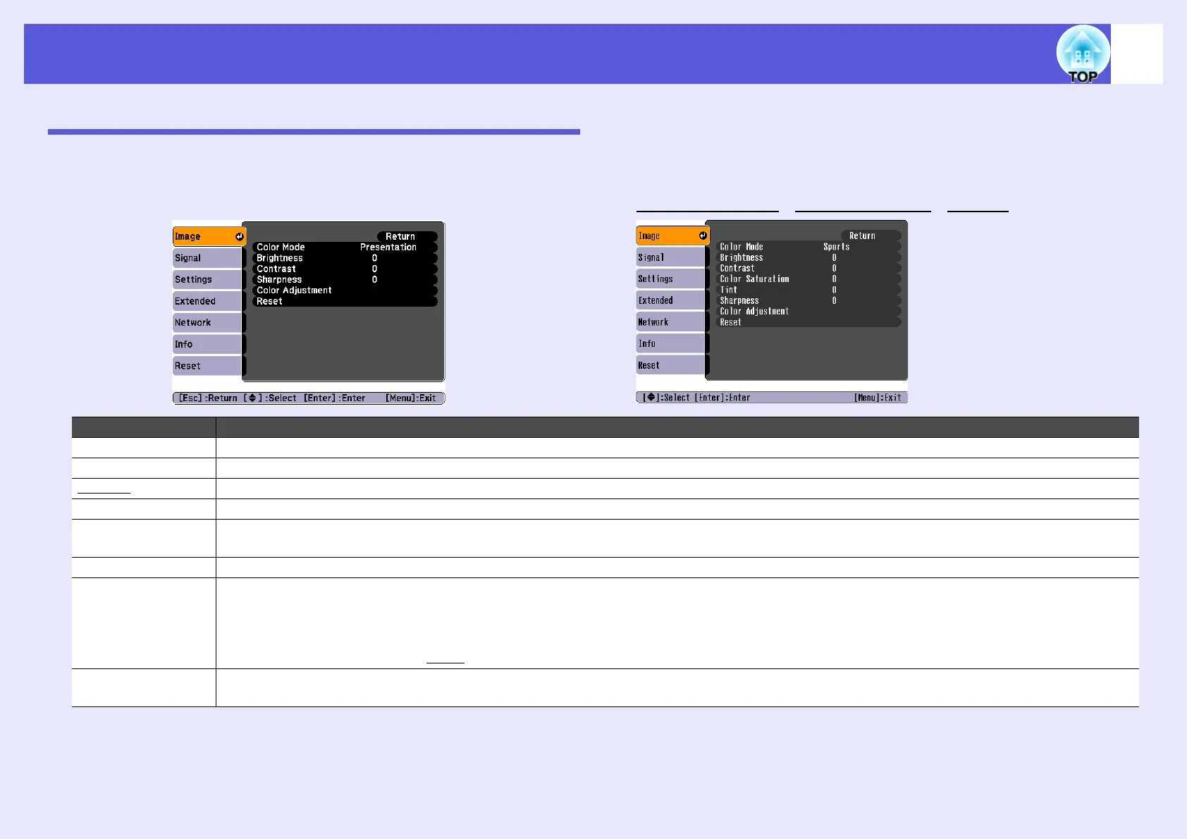 Items that can be set vary depending on the image signal currently being projected as shown in the following screen shots. Setting details are saved for each