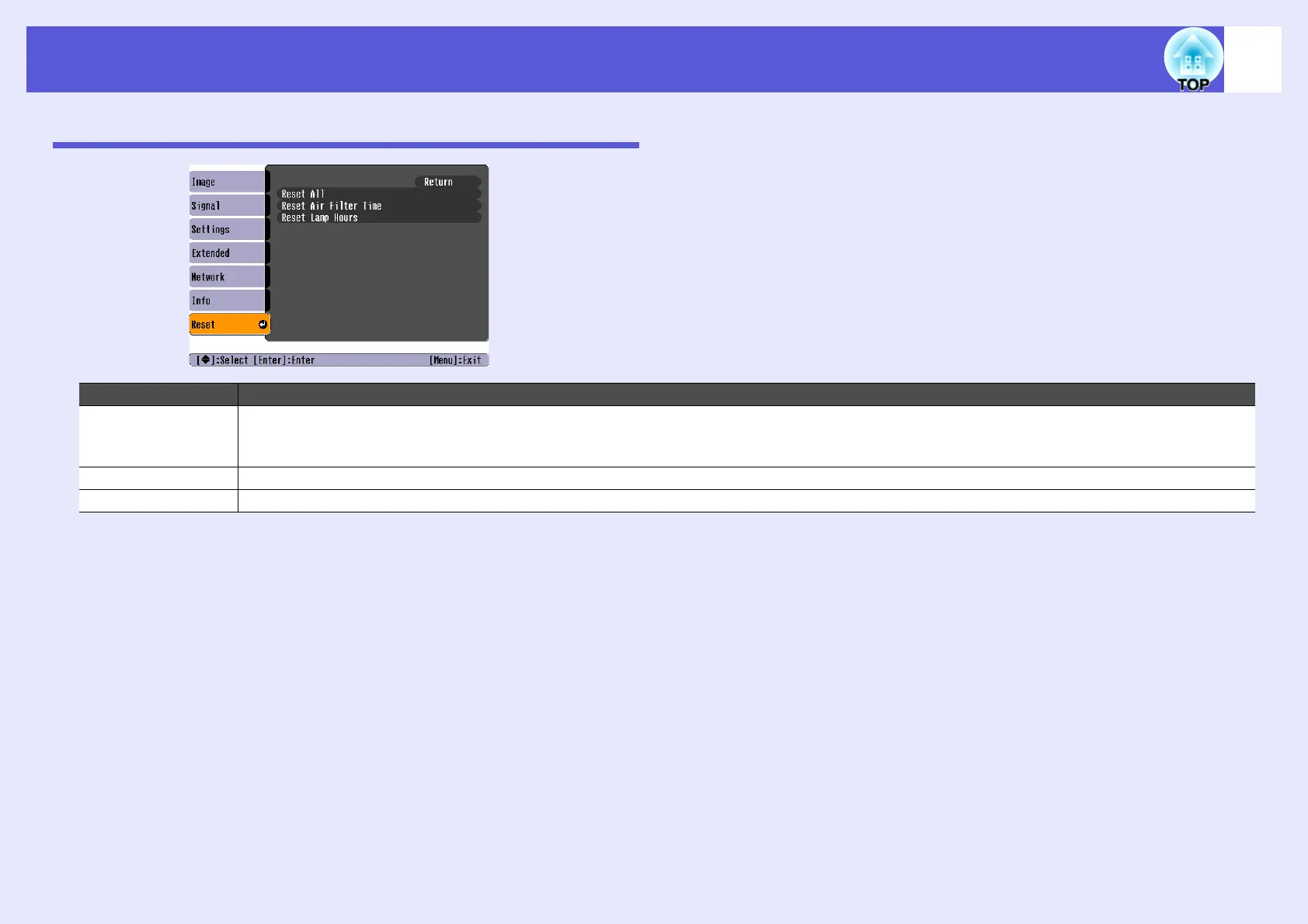 Reset Lamp Hours You can clear the cumulative lamp hours use time, and return it to "0H". Reset when you replace the lamp.