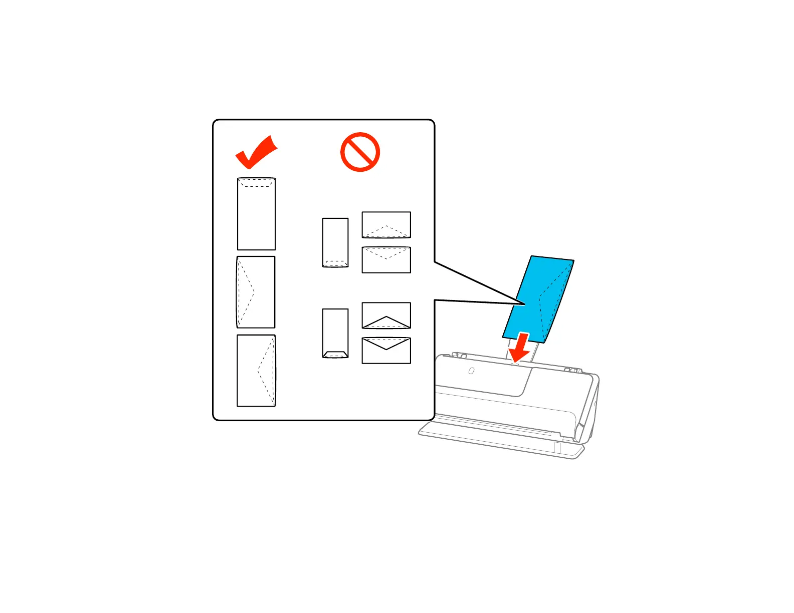 the shorter side, you can load the envelope with the flap side facing up. Insert the envelope into