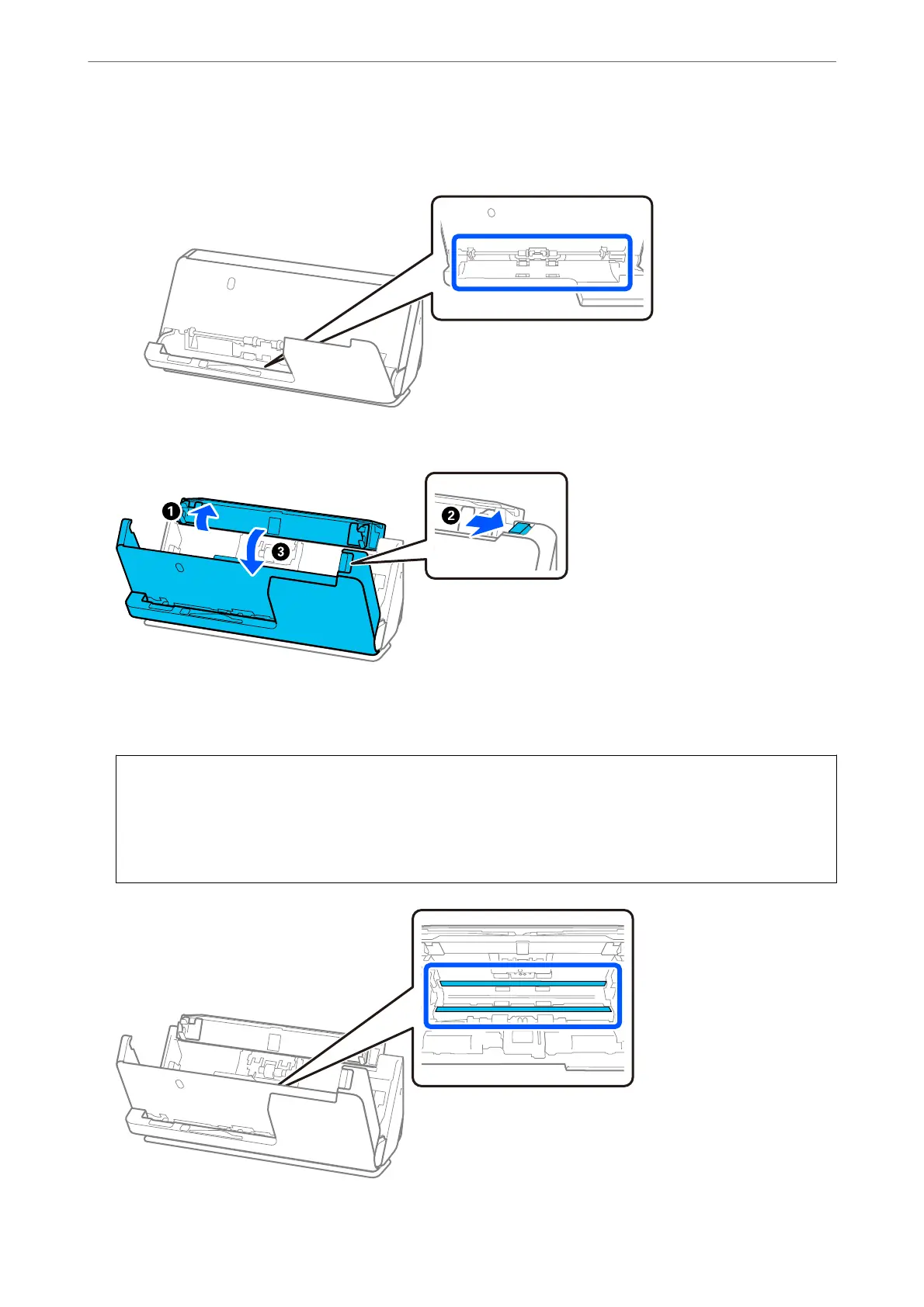 7. Wipe o any stains inside the scanner. Open the input tray, and pull the lever to open the scanner cover.
