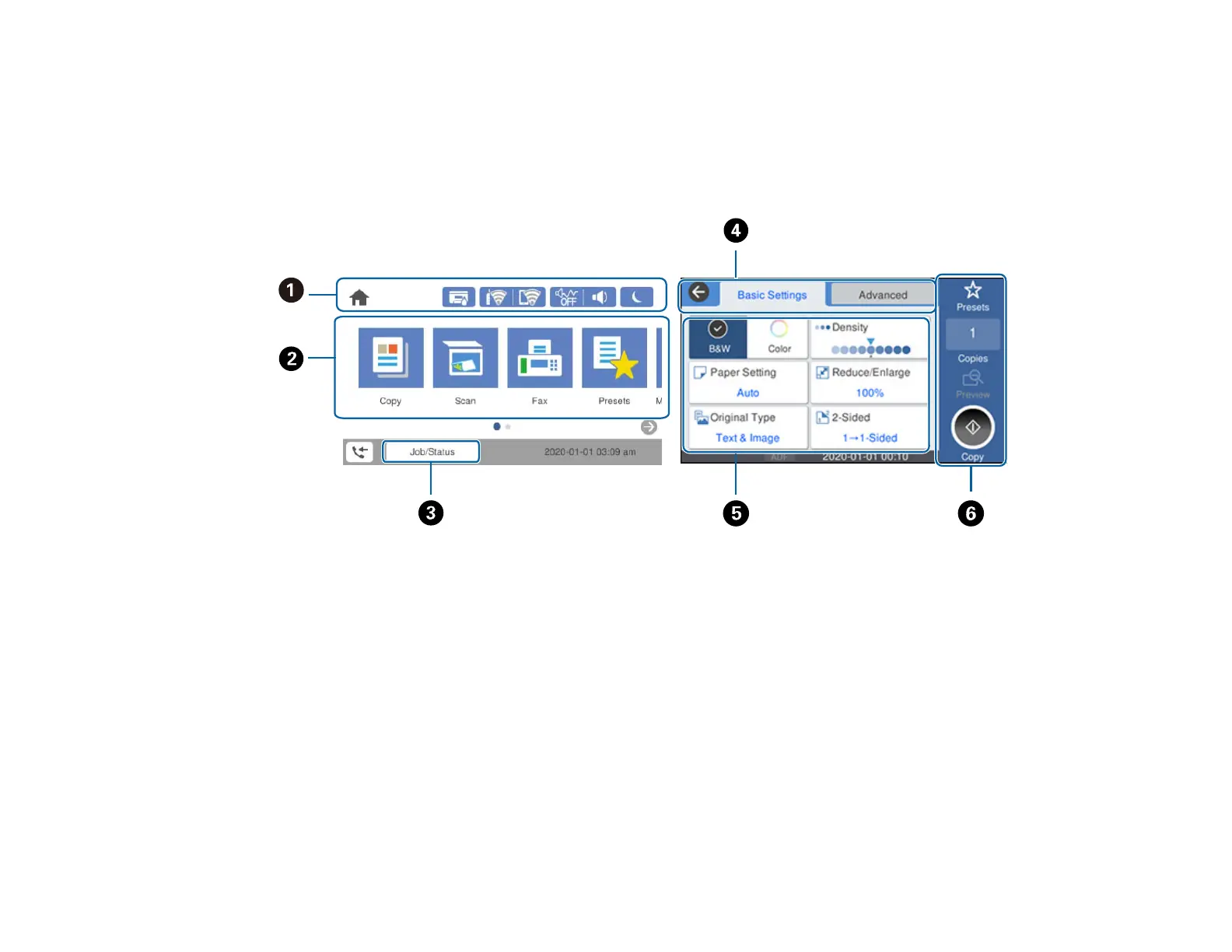 1 Displays various status information; select an icon to check its status or adjust its settings