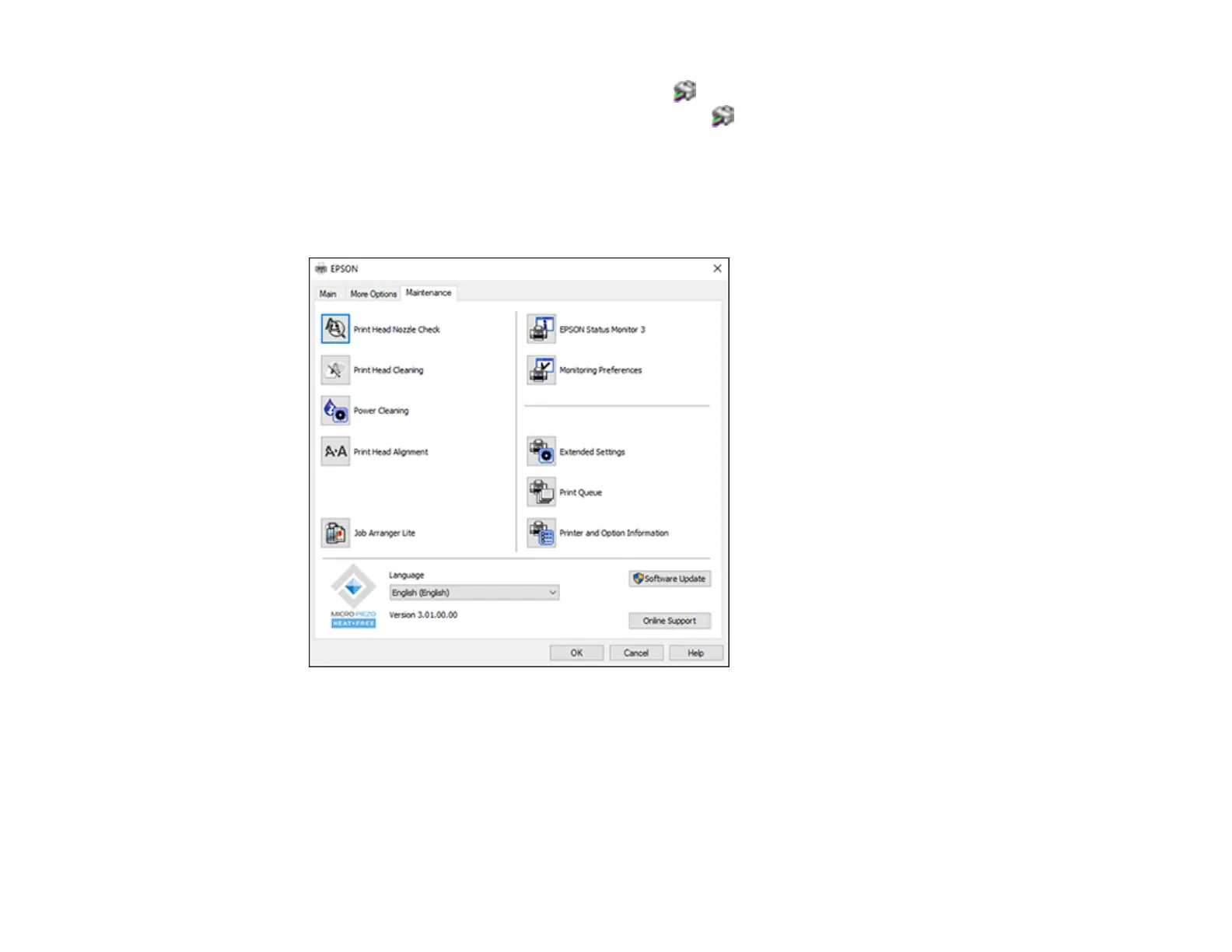 The printer software screens appear in the language you selected the next time you access them.