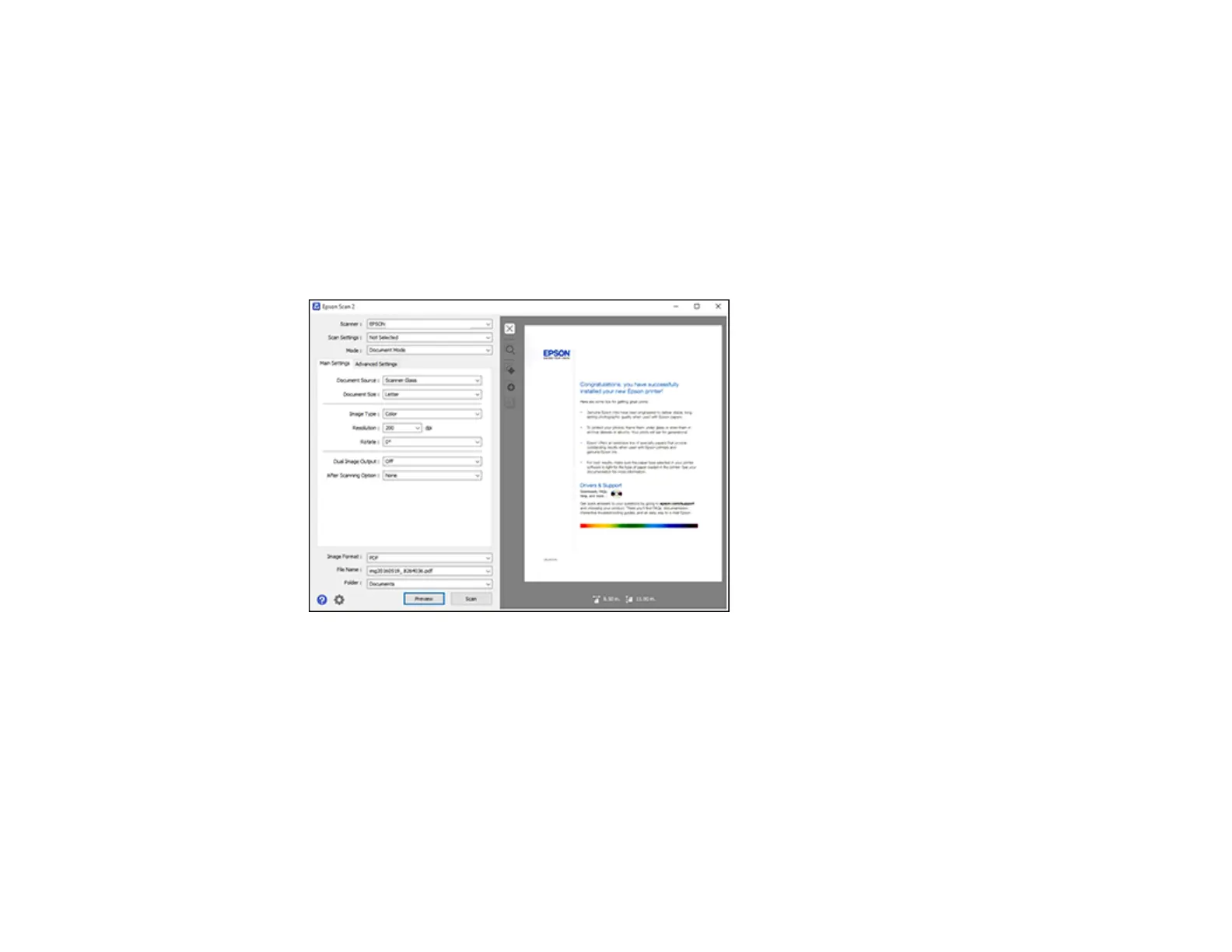 Epson Scan 2 previews your original and displays the results in the Epson Scan 2 window.