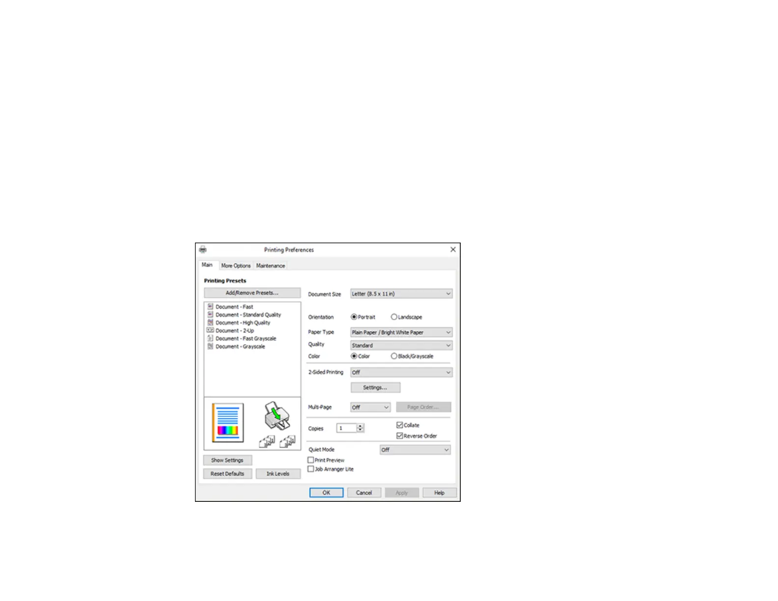You see the Main tab of your printer settings window: