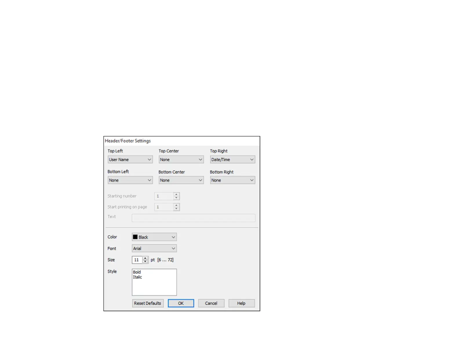 You can select any of the Header/Footer Settings options to add headers or footers when you print. The