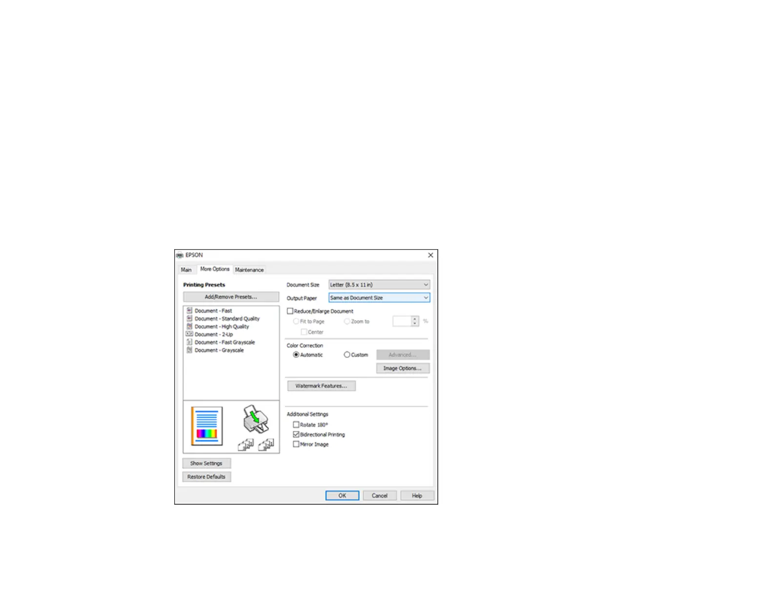 You can select a variety of additional layout and printing options for your document or photo on the More