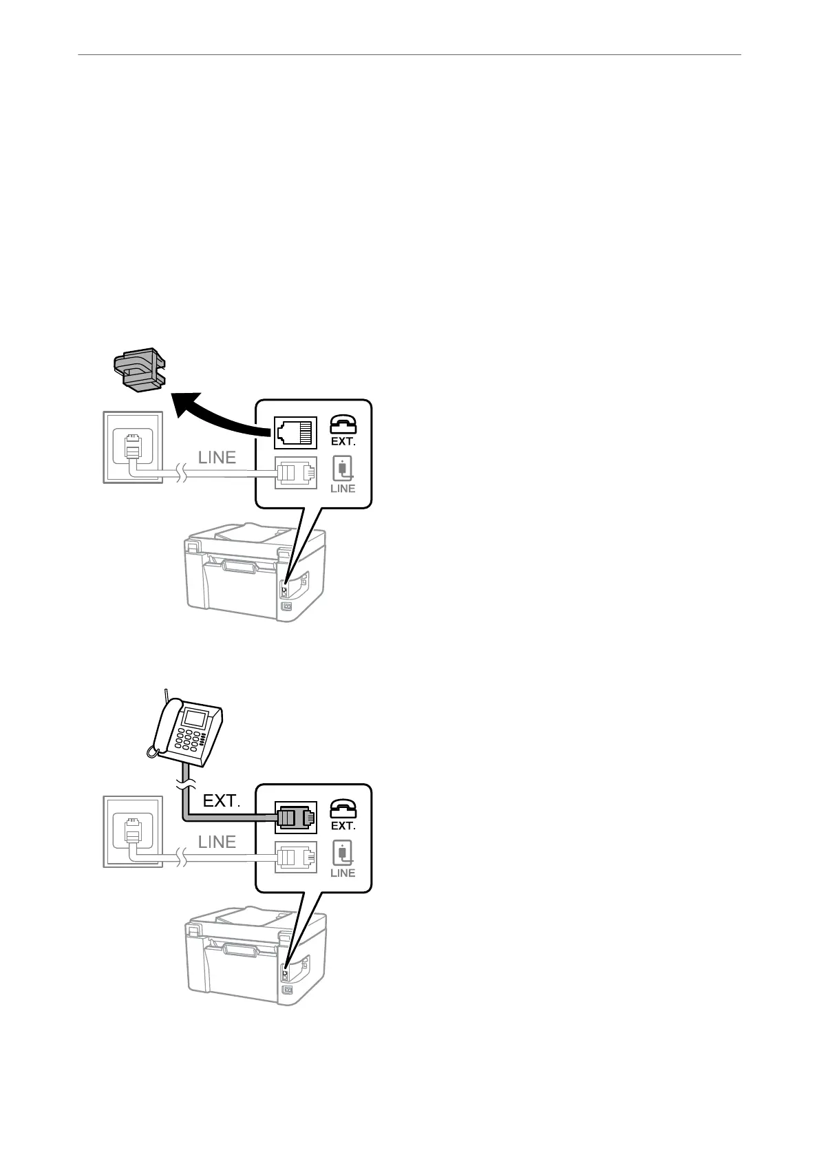 When sharing a single phone line, make sure you connect the phone device to the EXT. port of the printer. If you split