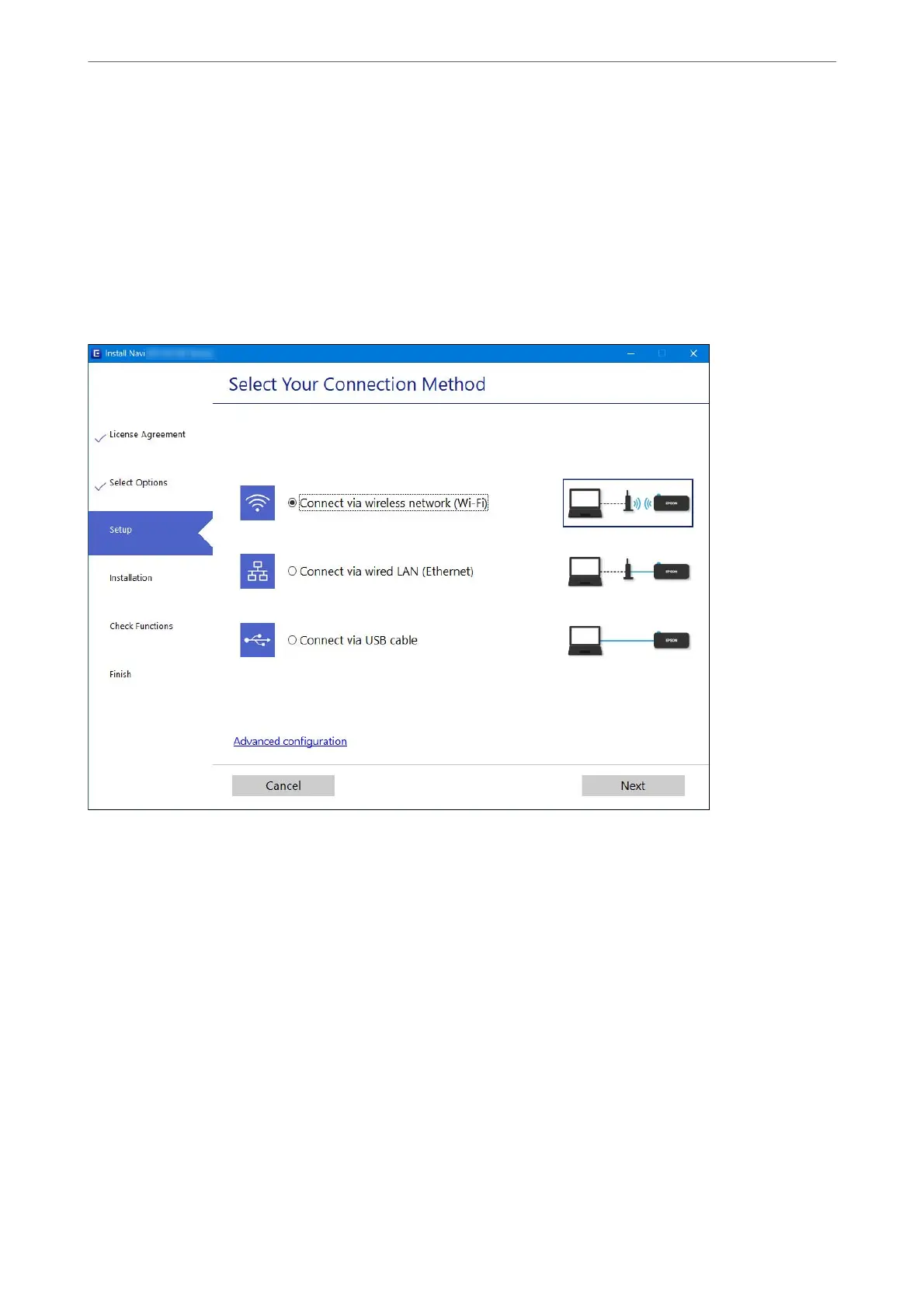 Select the network connection that you want to use, Connect via wireless network (Wi-Fi) or Connect via wired