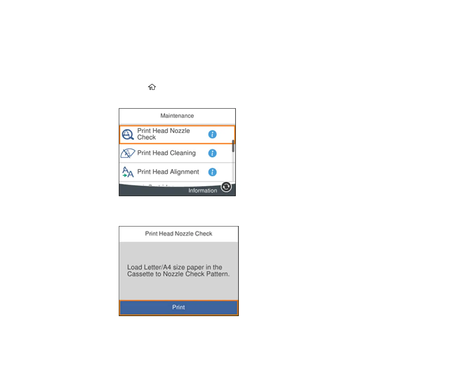 5. Press the OK button to select Print Head Nozzle Check.