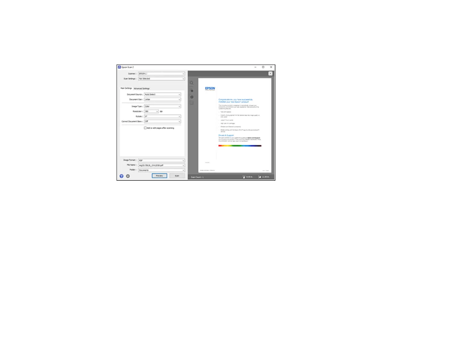 Epson Scan 2 previews your original and displays the results in the Epson Scan 2 window.