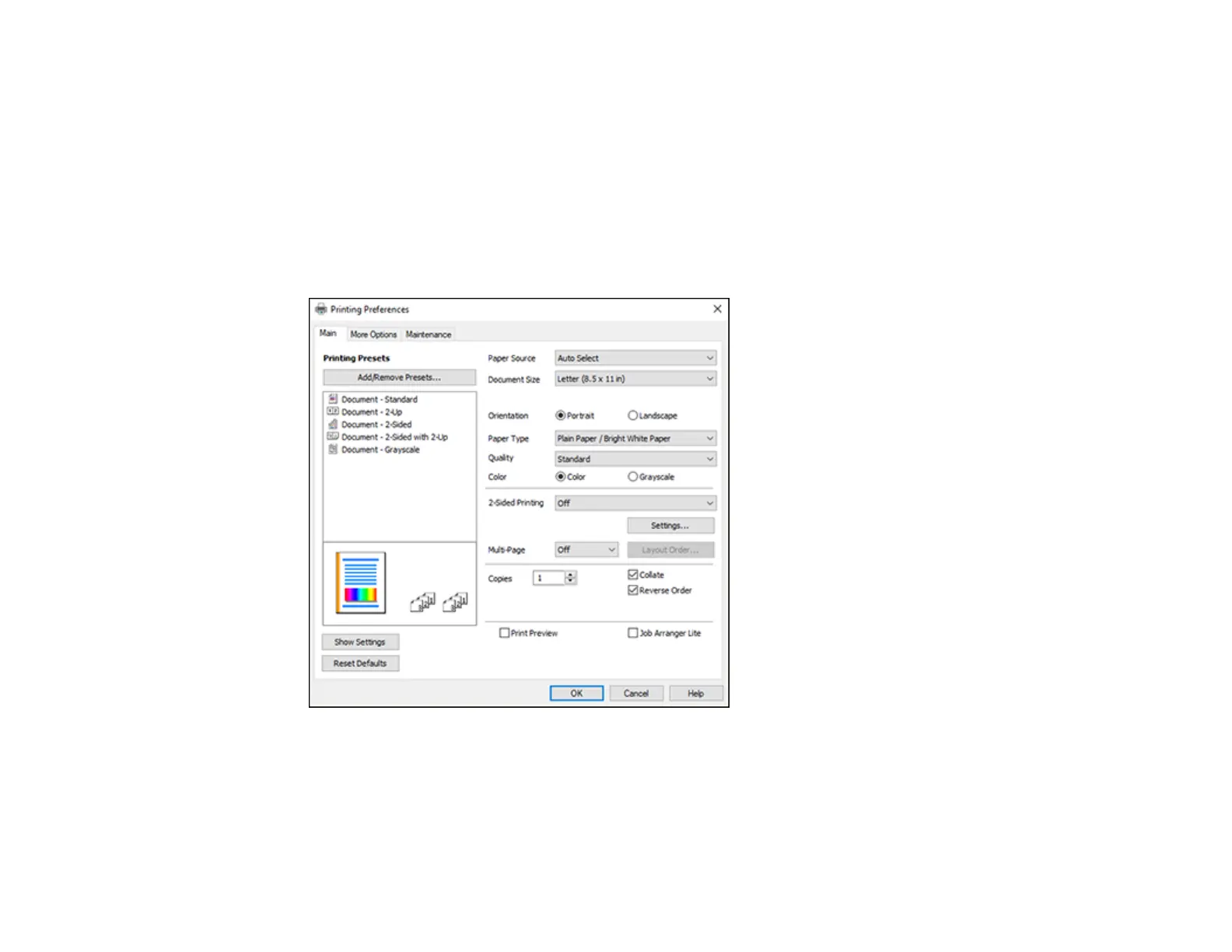 You see the Main tab of your printer settings window: