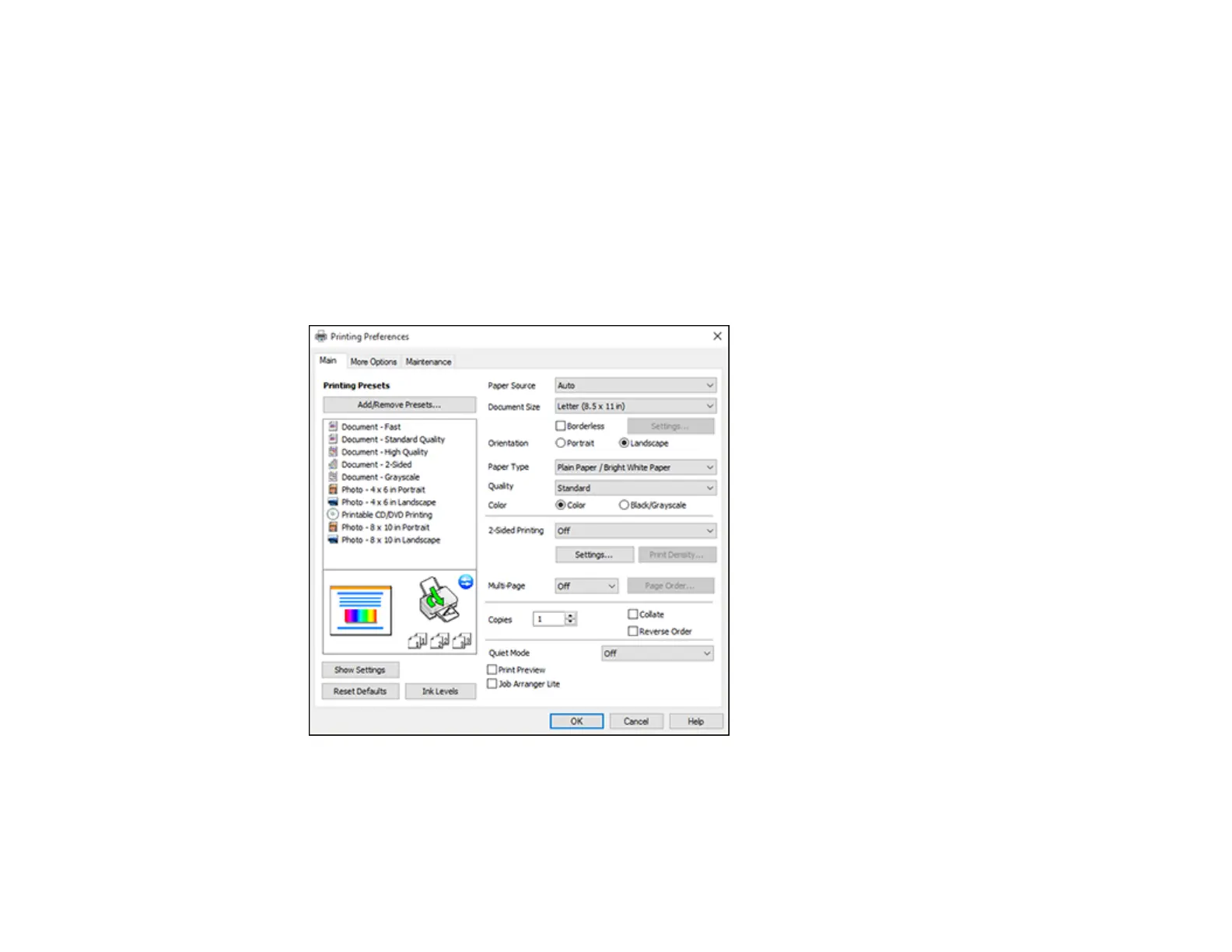 You see the Main tab of your printer settings window: