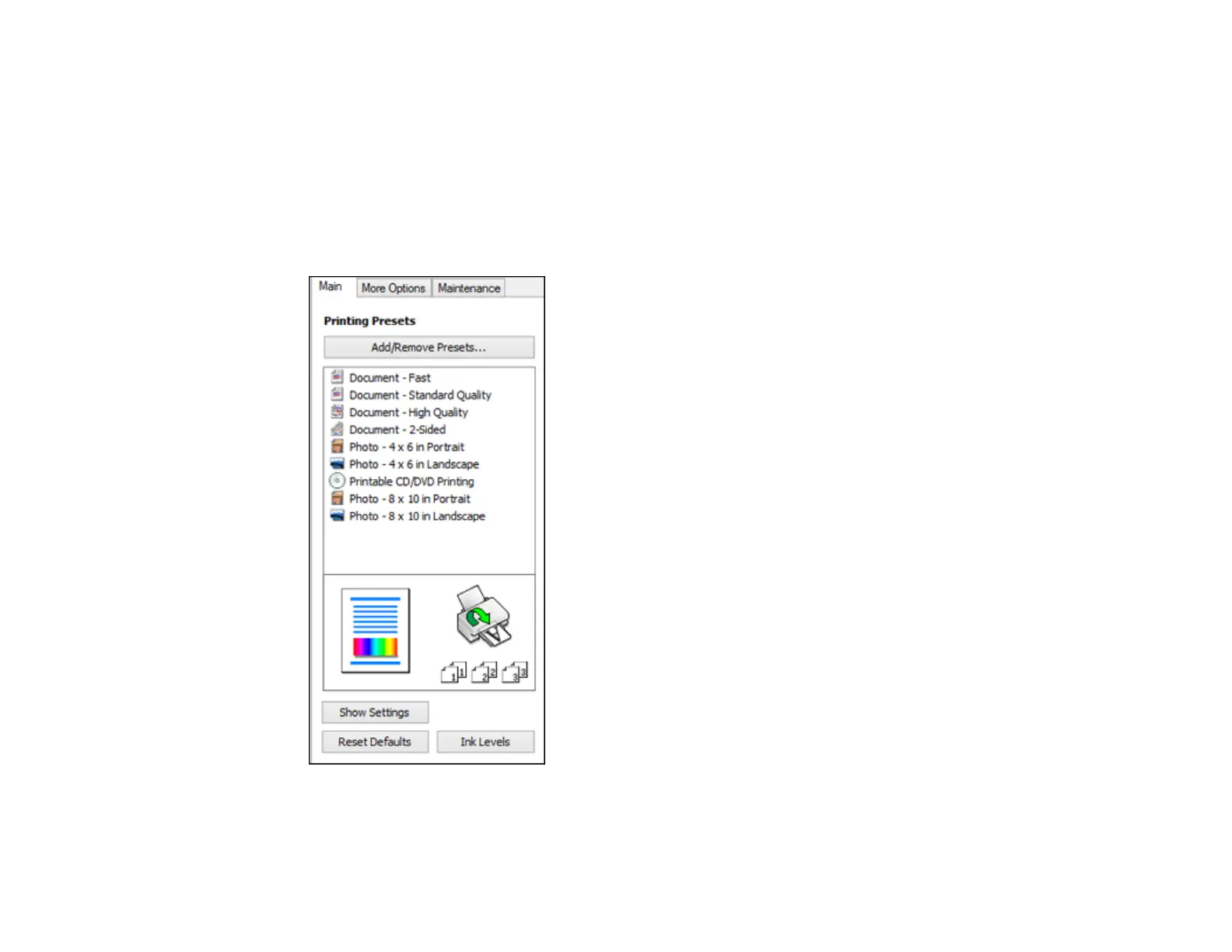 For quick access to common groups of print settings, you can select a printing preset on the Main or