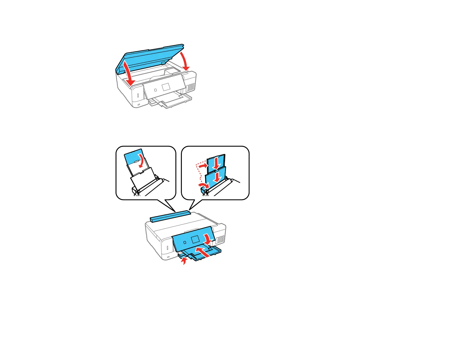 9. Close the rear paper feed support and rear paper feed cover. Close the output tray and the front