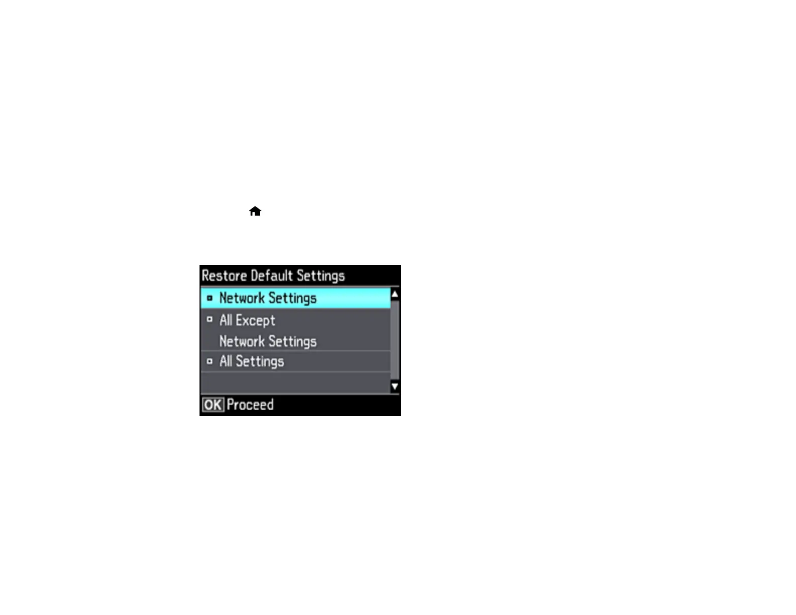 • All Except Network Settings: Resets all control panel settings, except for network settings.