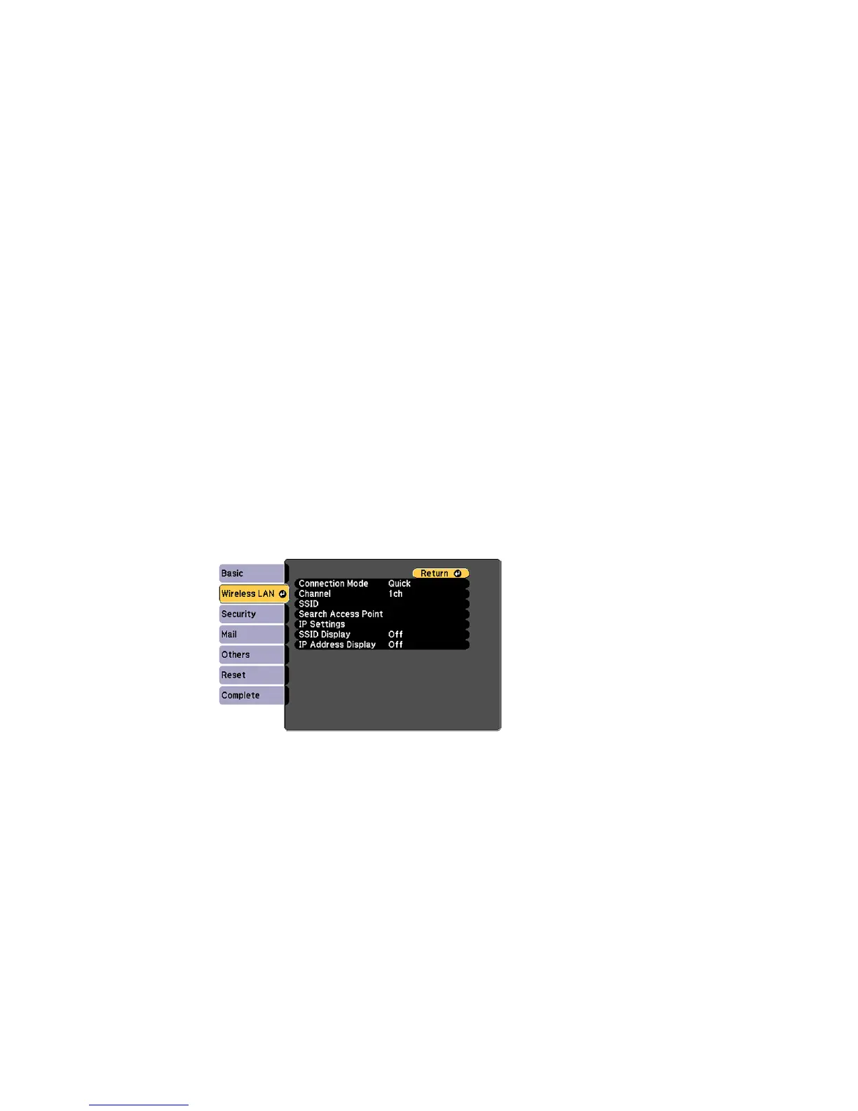 9. Select the settings on the Wireless LAN menu as necessary for your network.