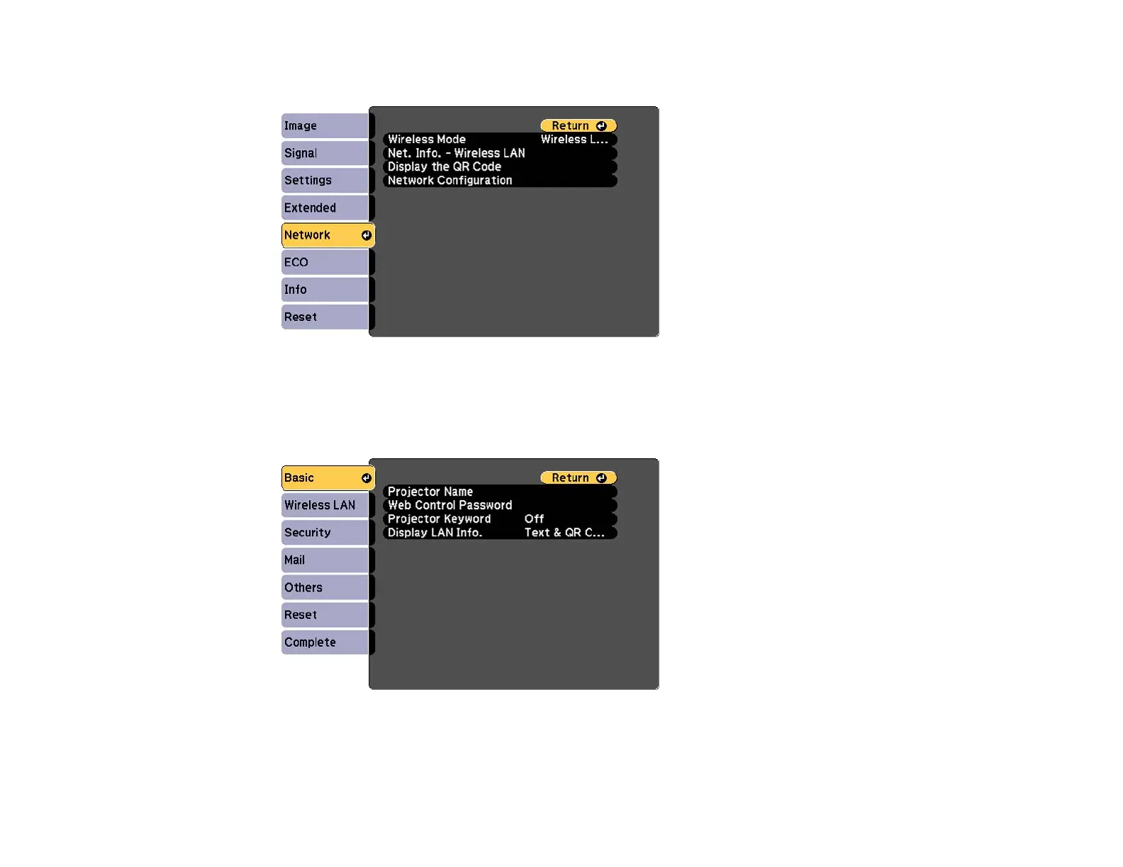 4. Set the Wireless Mode setting to Wireless LAN On and press Enter.
