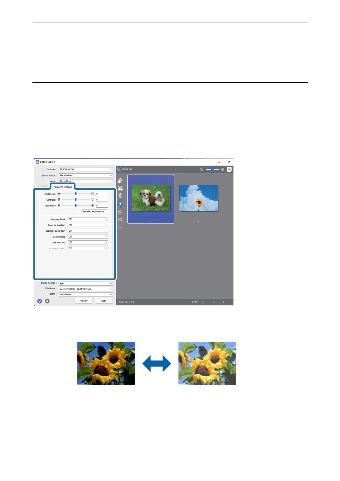 You can adjust scanned images using the features on the Advanced Settings tab in Epson Scan 2.