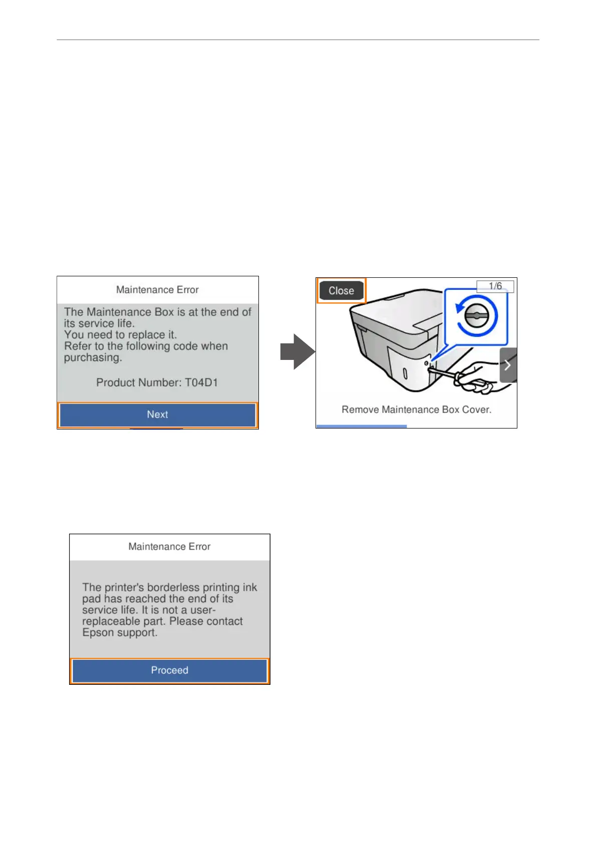 ❏ When the following screen is displayed, the part cannot be replaced by users. Contact Epson support.