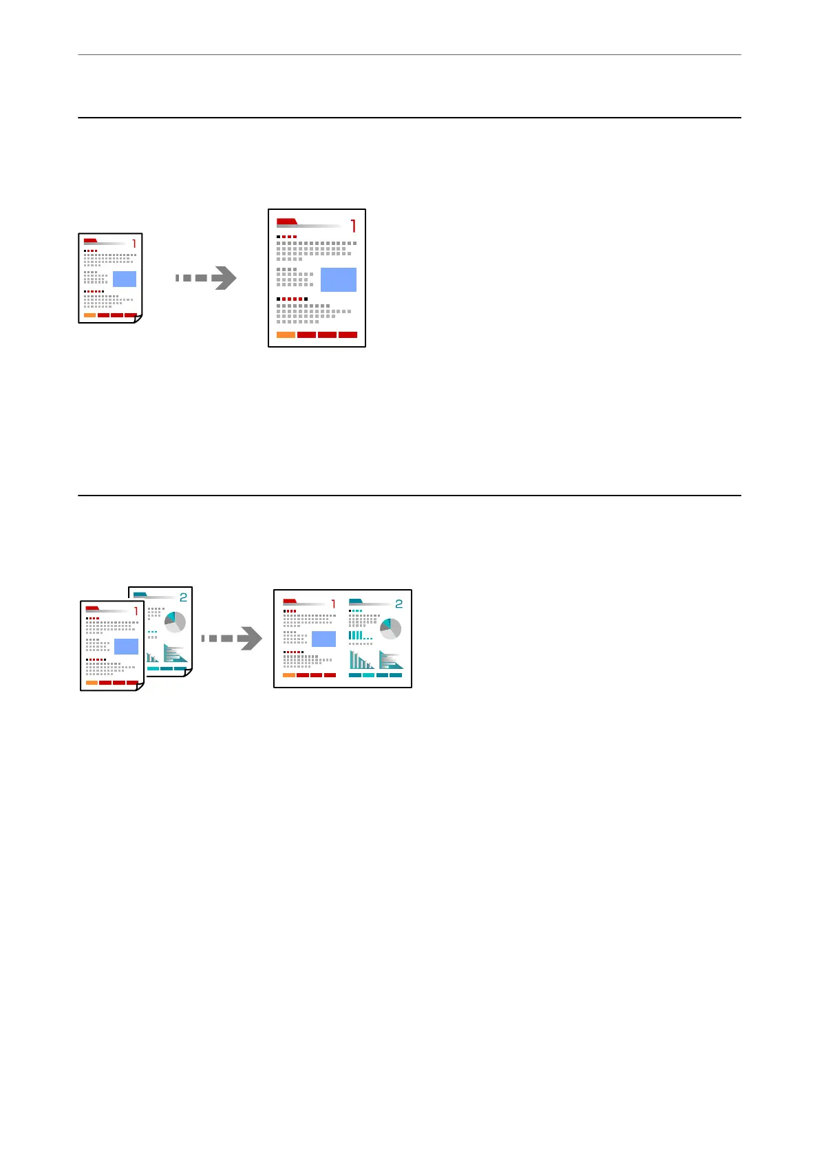 Copies two single-sided originals onto a single sheet in 2-up layout.