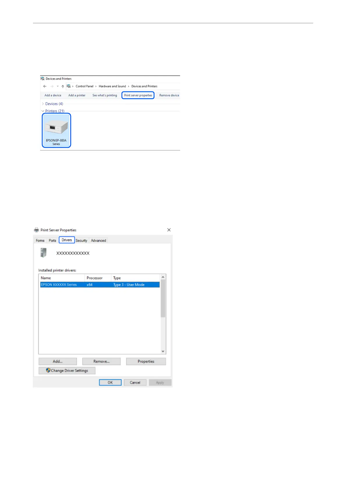 Click the printer icon, and then click Print server properties at the top of the window.