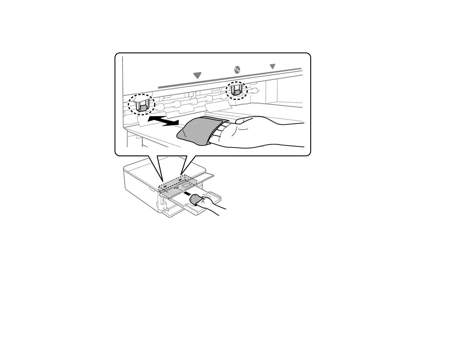 13. Gently wipe the two white rollers shown here using a soft, moist cloth. Gently rotate the rollers to